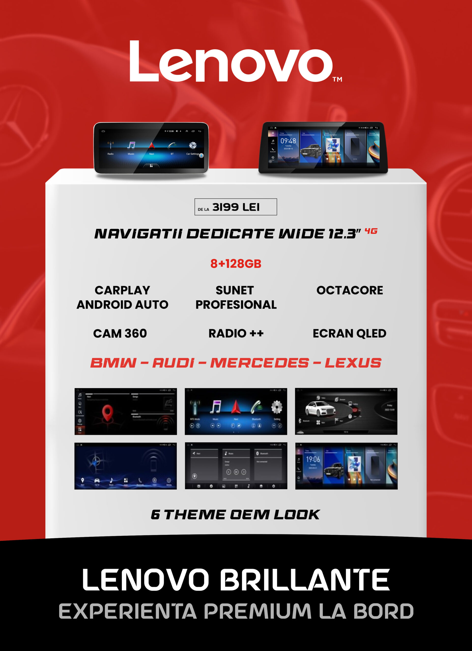 - Brillante: Această gamă este special concepută pentru vehicule de lux precum BMW, Audi, Mercedes și Lexus. Echipamentele sunt personalizate pentru fiecare marcă și includ toate funcțiile avansate ale gamelor anterioare, cu un design dedicat pentru a se integra perfect în bordul acestor vehicule. Sistemele includ 6 teme OEM Look pentru personalizare, asigurând o integrare perfectă cu estetică vehiculului.