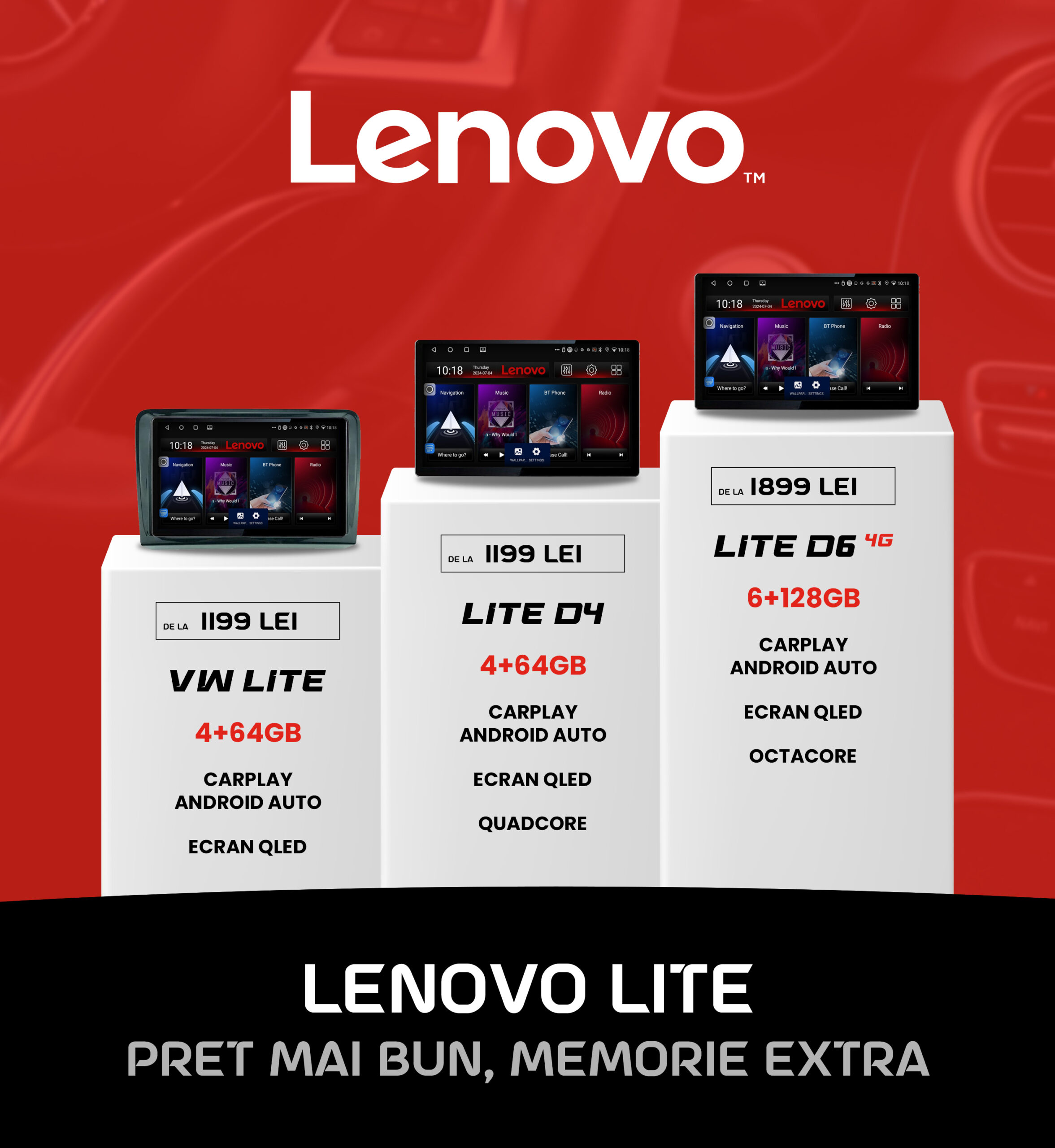 - VW Lite și Lite D4: Aceste modele sunt accesibile și oferă funcții de bază precum CarPlay și Android Auto. Memoria disponibilă este de 4+64GB, ecranul QLED asigurând o vizibilitate clară și detalii precise.