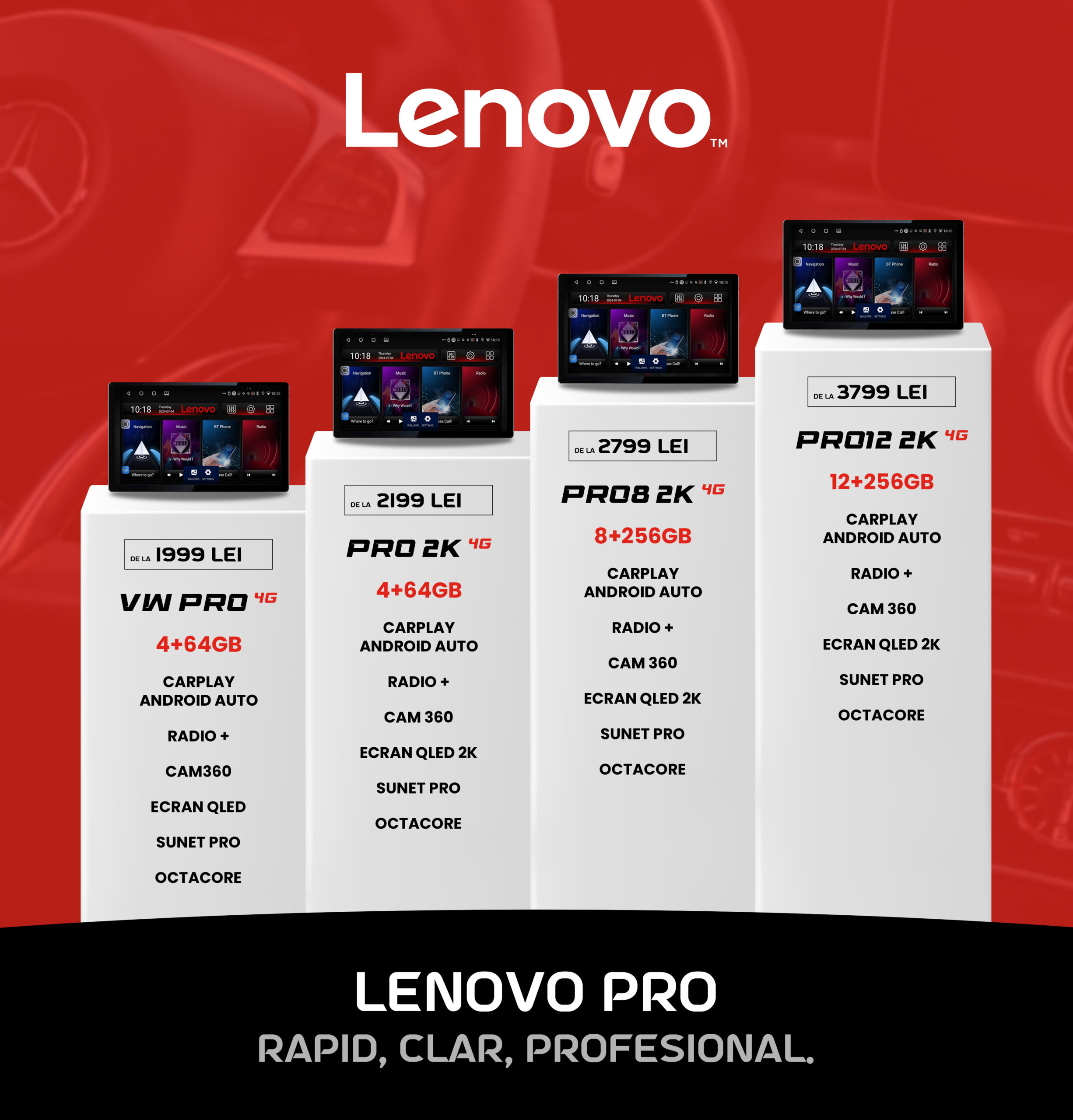 - Pro8 2K 4G și Pro12 2K 4G: Aceste modele sunt ideale pentru utilizatorii care doresc un ecran mai mare și mai multe funcții, inclusiv sunet profesional și navigație avansată.