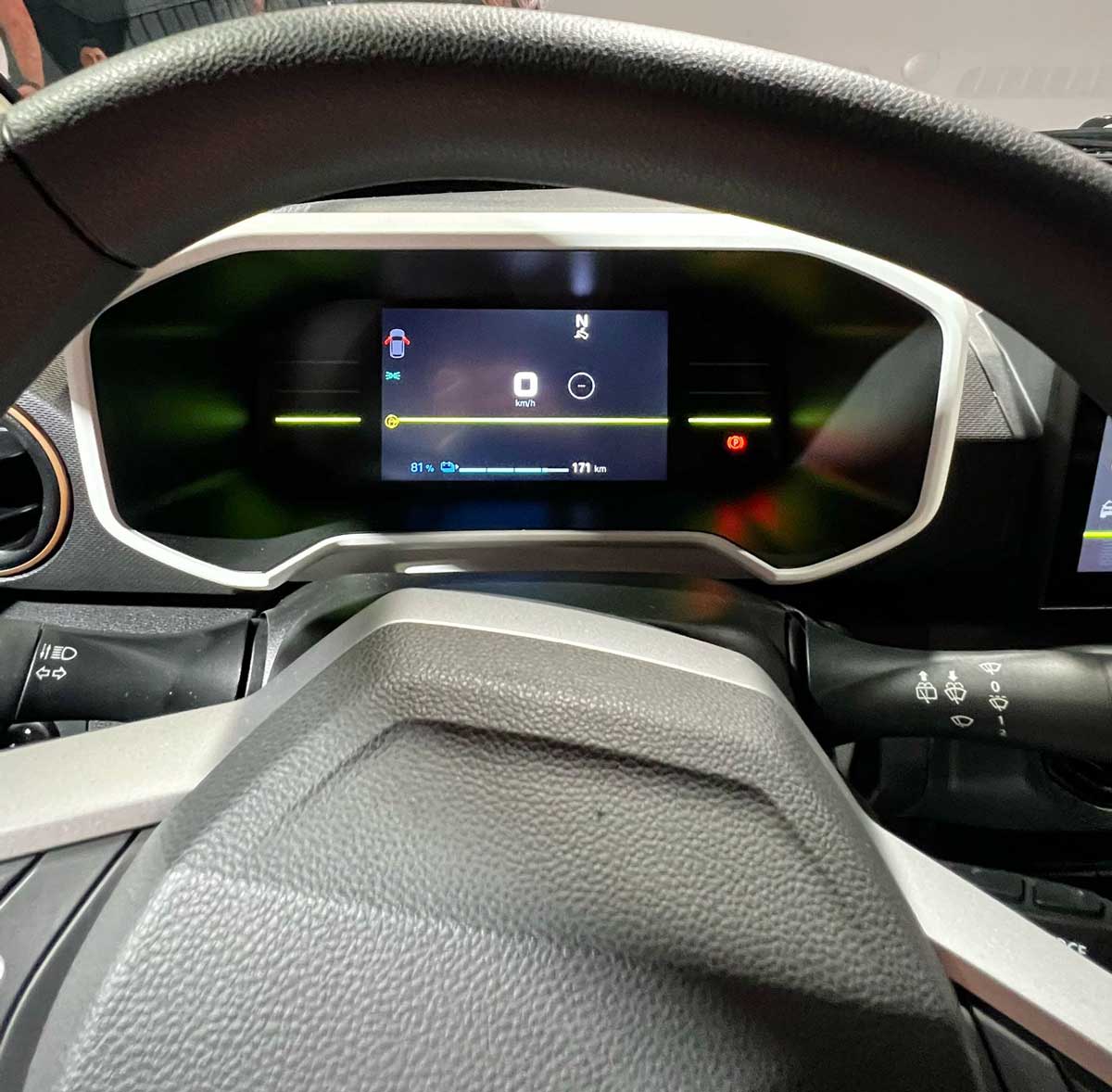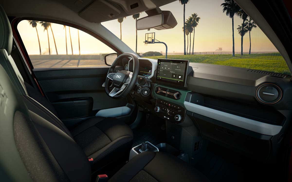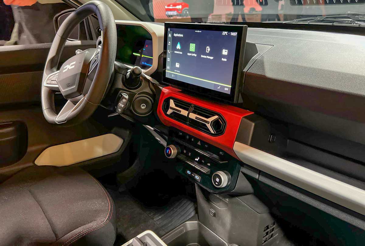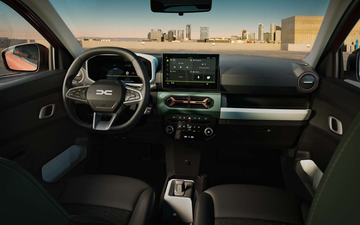 Încă de la cea mai ieftină versiune, Essential, există instrumentar digital configurabil, de 7 inchi. Sistemul multimedia Media Nav Live cu ecran tactil de 10 inchi este disponibil standard la echiparea de top, Extreme, și opțional la Expression. Acesta este situat cât de sus se poate, pentru a optimiza ergonomia, permite conectarea smartphone-ului folosind protocoalele Apple CarPlay și Android Auto wireless și dispune de două mufe USB-C. În sfârșit, accesoriile YouClip de la Duster pot fi montate și pe noua Dacia Spring. Numai că Spring are doar trei prinderi, toate situate în față.