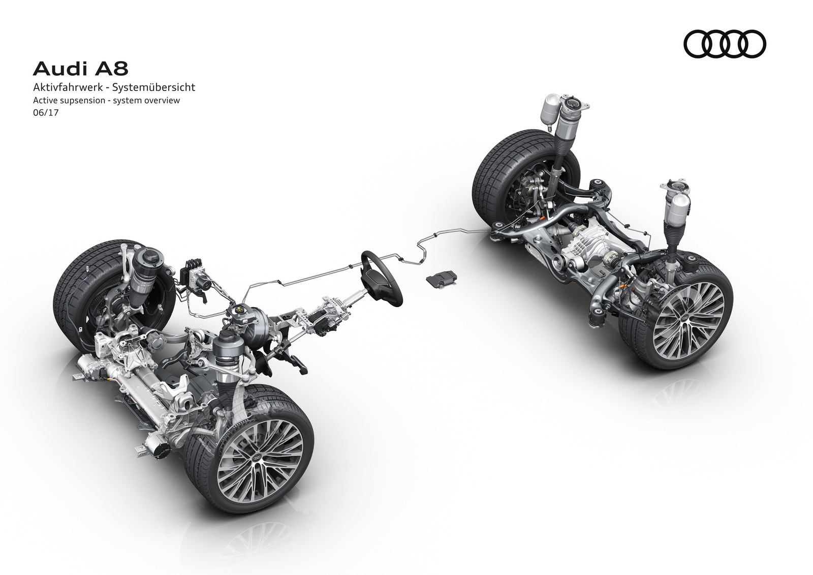Nava amiral Audi va fi înzestrată în premieră cu una dintre cele mai sofisticate suspensii din segmentul de lux, bazată pe arhitectura electrică revoluționară de 48 volți a noului model. Noua suspensie activă inteligentă electromecanică acționează independent fiecare roată, adaptând gradul de rigiditate al amortizoarelor la condițiile de rulare cu ajutorul camerei video frontale care scanează drumul de 18 ori pe secundă și a unui sistem complex compus din patru motorașe electrice, câte unul pentru fiecare roată, un tub rotativ cu o bară internă de torsiune din titaniu și câte un braț care exercită o forță de până la 1.100 Nm.