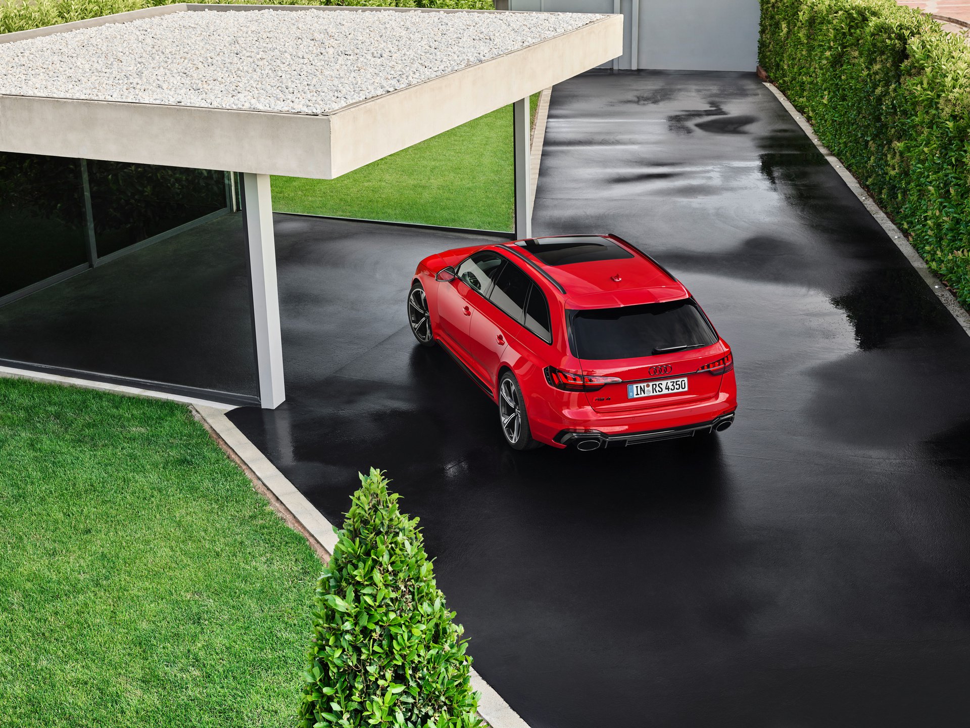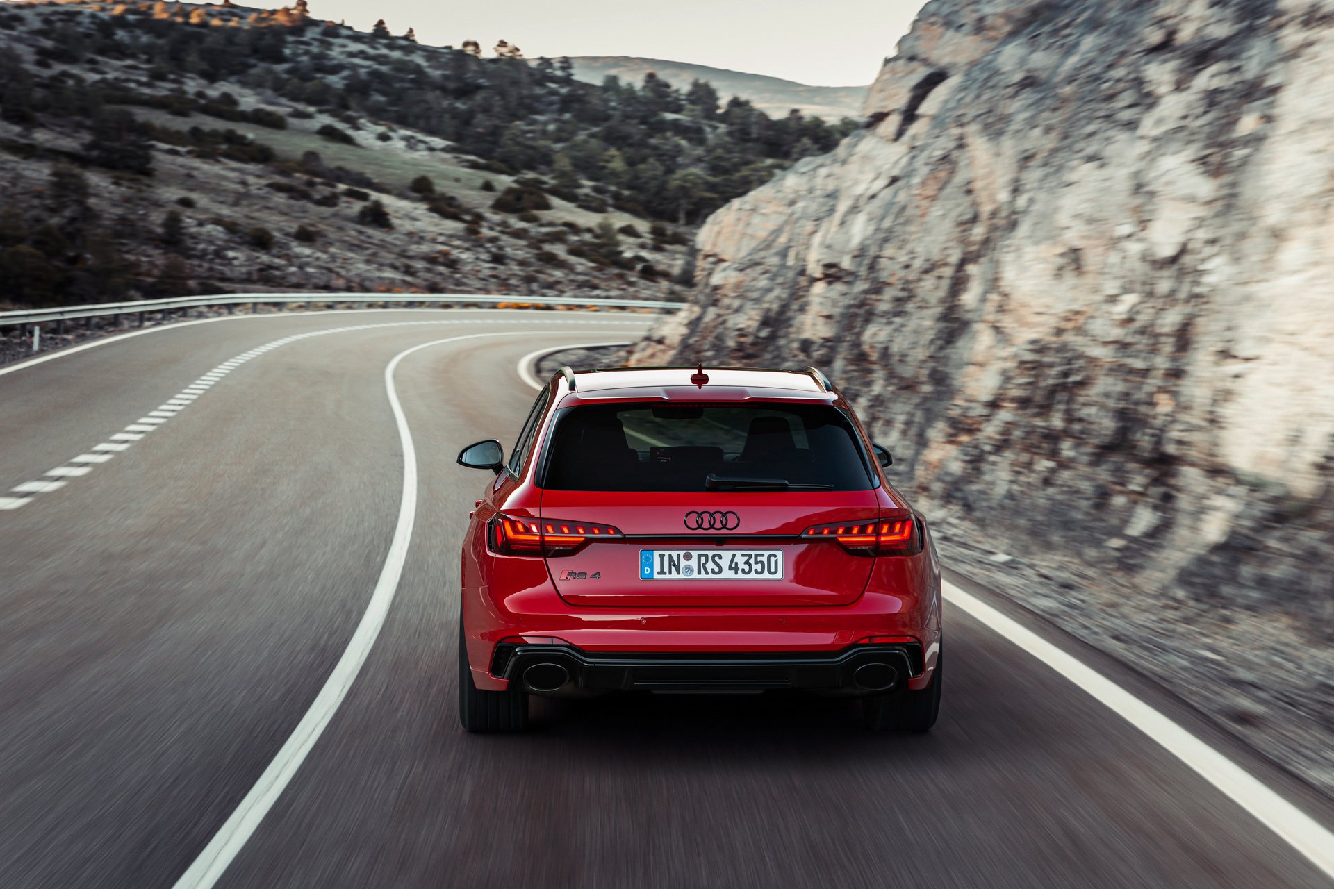 Aripile spate mai proeminente, cu 30 mm mai late decât ale modelului A4 standard, îi subliniază natura robustă și atletică. O bară nouă și stopuri noi își fac apariția în partea din spate. Evacuarea RS sport cu terminații de culoare neagră poate fi comandată contra cost. Șoferul poate regla tonalitatea sistemului de evacuare prin intermediul sistemului Audi drive select dynamic.