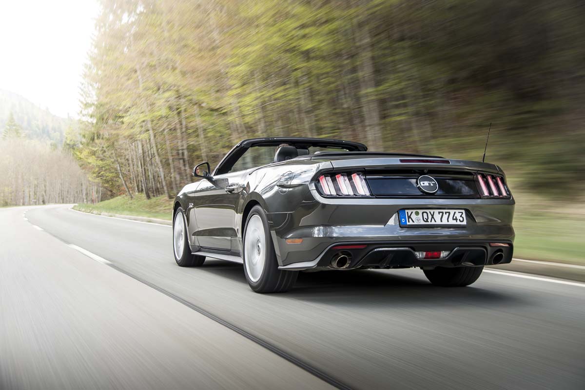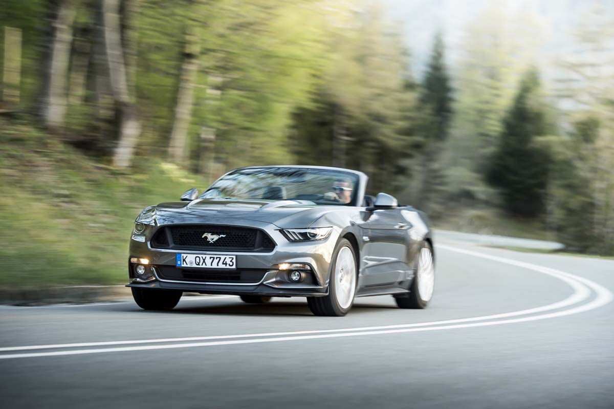 Şi ca să justifice avântul cu care abordează piaţa europeană, Mustang are o ţinută de drum care să facă cinste lui Ford. Pentru prima dată în istoria modelului s-a optat pentru soluţia constructivă cu punte spate independentă. Astfel, roţile care trag au libertatea de a dansa în voie pe drum, în special în cazul condusului dinamic, iar asta se simte cel mai bine în volan. Maşina se aşează bine pe drum, calcă foarte precis şi te poate arunca cu maximă plăcere pe drumurile virajate de munte, o caracteristică nu tocmai americană.