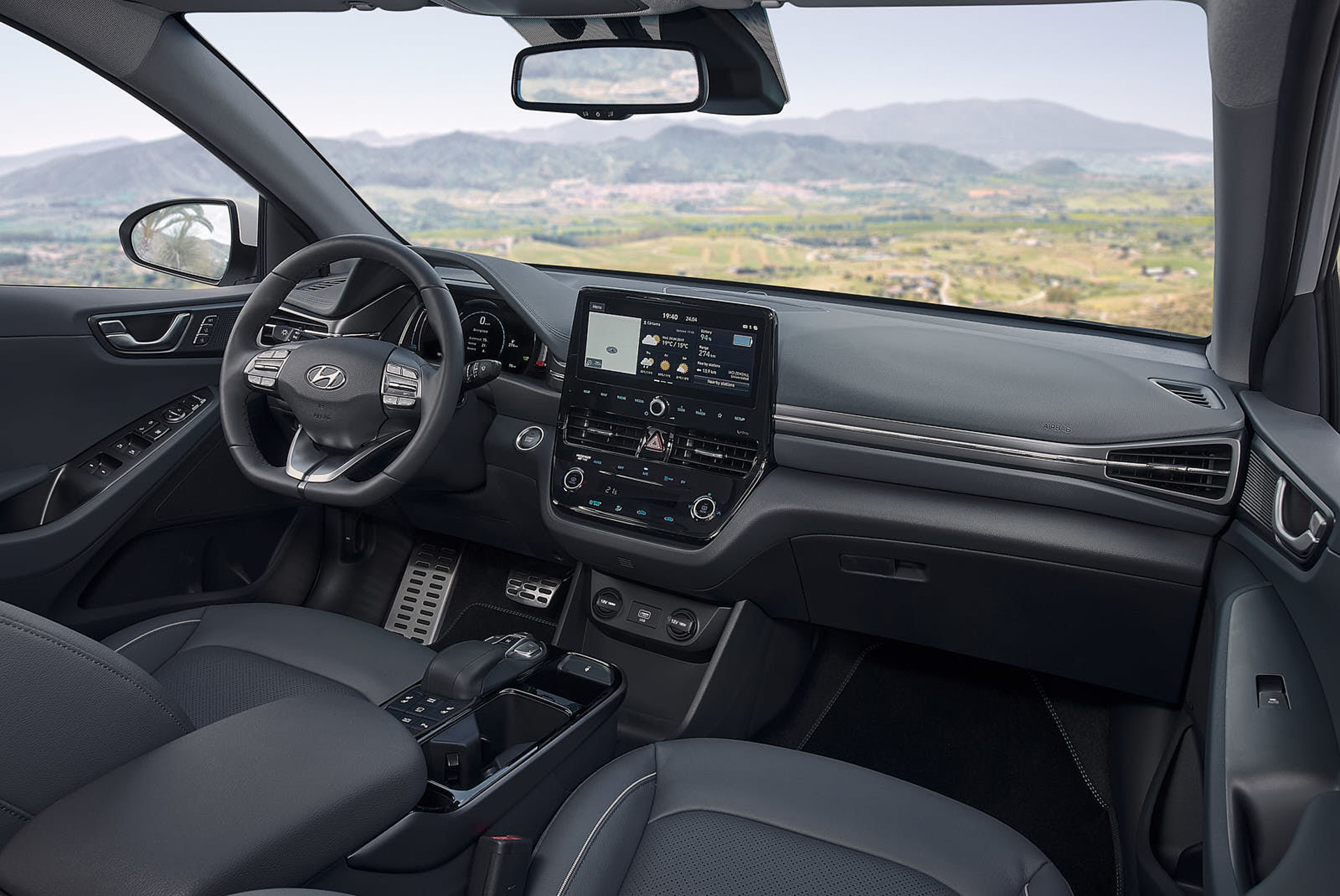 Hyundai a redesenat consola centrală, care prezintă acum finisaje negre lucioase. Apar acolo butoane tactile pentru controlul încălzirii, ventilației și aerului condiționat. Ioniq Electric primește standard ecran LCD de 7 inci, care este opțional pentru versiunea plug-in hybrid.