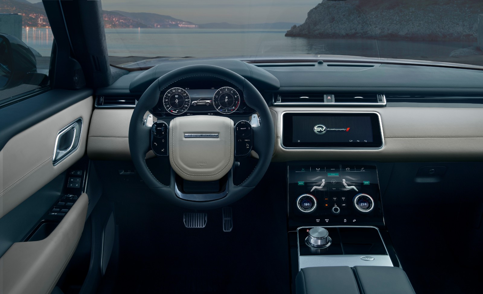 În plus față de un Velar standard, SVAutobiography Dynamic Edition primește la interior cu tapițerie din piele perforată disponibilă în patru culori (Ebony, Cirrus, Vintage Tan și Pimento) cu dublă cusătură, cu volan sport cu padele din aluminiu, butoane și schimbător cu finisaje tot din aluminiu. Scaunele față sunt încălzite și ventilate și au standard funcție de memorie și masaj.