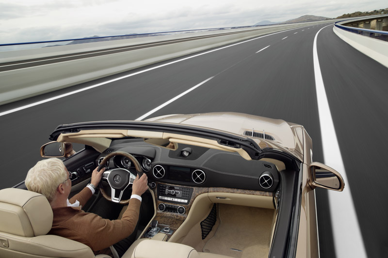 Plansa de bord se aseamana destul de mult cu cea a noului SLK, cu o abordare clasica si eleganta a zonelor de control multimedia/climatizare. Dintre dotarile optionale se merita precizate Magic Sky Control (plafon din sticla cu opacitate reglabila electric) si Frontbass (sistem special de dispunere a boxelor responsabile cu sunetele joase). Siguranta nu a fost trecuta cu vederea, roadsterul SL fiind disponibil cu la fel de multe sisteme active si pasive de siguranta ca si varful de gama Mercedes-Benz Clasa S.