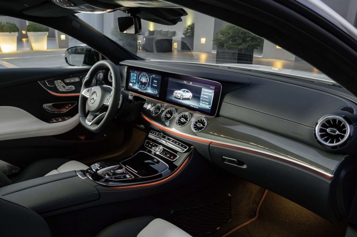 Și la interior, influențele venite din partea noului E-Class sedan sunt evidente. Filozofia Widescreen Cockpit a fost preluată ad-literam și de noul E-Class Coupe, planșa de bord fiind dominată de cele două display-uri TFT (opționale) de 12,3 inch, încadrate de aceeași ramă. Standard se oferă un display central de 21,3 cm și un ecran de 17,8 cm, încadrat de ceasuri de bord analogice.