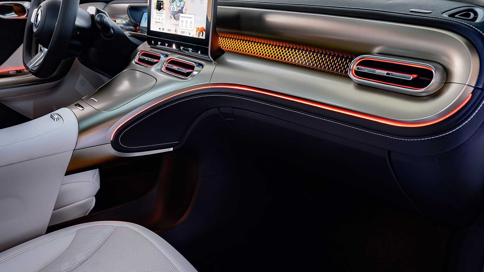 Interiorul se evidențiază prin cele trei ecrane. Cel mai mare stă în centru, măsoară 12,8 inchi și afișează informațiile sistemului multimedia, care se updatează over the air. Apoi, există un instrumentar digital full-HD de 9,2 inchi și un head-up display de 10 inchi.
