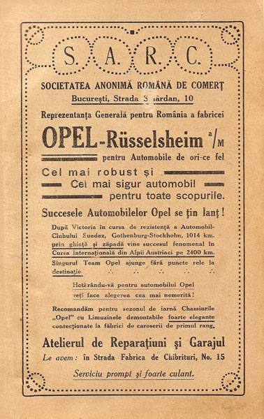 Societatea Anonimă de Comerţ cu sediul în Bucureşti, str. Smârdan nr. 10, publica în această lucrare o reclamă la produsele Opel pe care le comercializa: