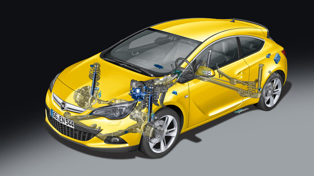 O mare parte din dezvoltarea șasiului a avut la bază introducerea în configurația standard a modelelor GTC, pe puntea față, a suspensiei HiPerStrut. Aceasta este o soluție tehnică ce înlocuiește clasica arhitectură a suspensiei MacPherson. Particularitatea este separarea mișcării rotative a fuzetei de cea a basculei, aceasta din urmă păstrându-și poziția în relație cu amortizorul, urmând mișcarea acestuia. Rezultatele majore ale utilizării acestui HiPerStrut sunt o aderență mai bună mulțumită unghiului de cădere, o direcție mult mai precisă decât una clasică și diminuarea semnificativă a efectului de torque steer.