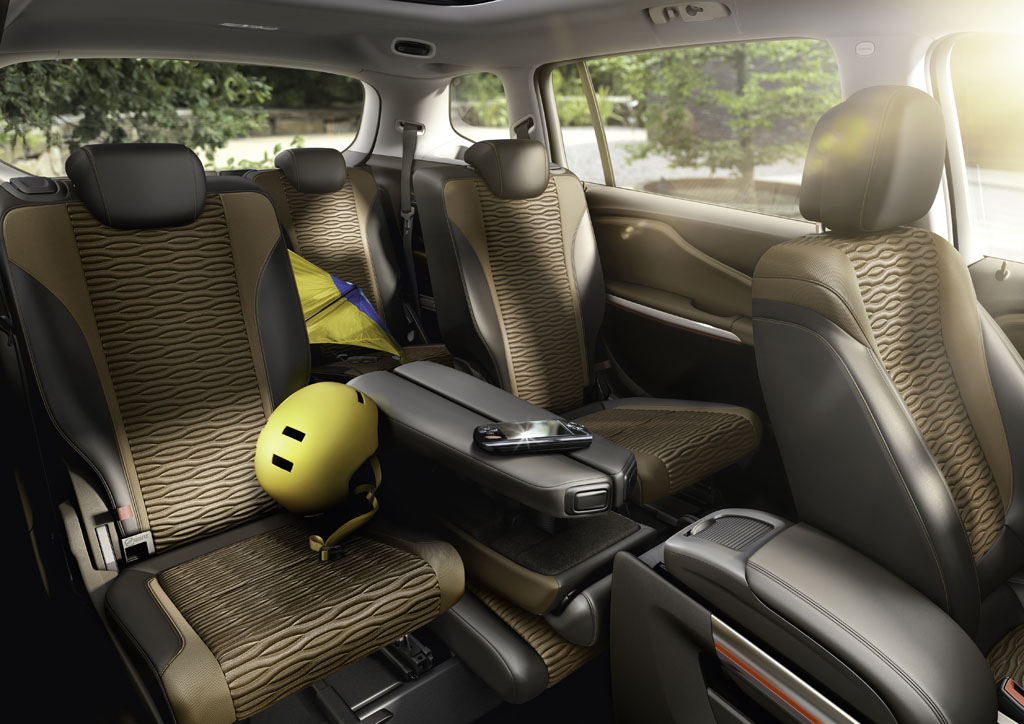 Ajuns la cea de-a treia generație, modelul este și mai impresionant la capitolul la care a excelat întotdeauna: interiorul. Și cu precădere modularitatea și versatilitatea sa. Sistemul Flex 7 a fost reproiectat, iar cei care au făcut asta au făcut o treabă excelentă. Spre deosebire de generația precedentă, bancheta este fracționabilă și compusă din trei segmente. Opțional este disponibil un sistem botezat Lounge, care permite culisarea scaunelor exterioare spre interior și transformarea spătarului scaunului din mijloc într-o cotieră dimensionată generos. Cumulat cu posibilitatea de culisare a scaunelor spre înapoi cu 110 mm și cu rabatarea spătarelor cu până la 24 de grade pe spate, obținem un spațiu în care doi pasageri se pot simți ca la bordul unui automobil de lux. Al treilea rând de scaune, odată pliat complet în podea, lasă loc unei capacități de 710 litri pentru portbagaj. În configurația cu șapte locuri (ce poate găzdui șapte adulți fără probleme) volumul util al portbagajului se reduce la numai 152 de litri.