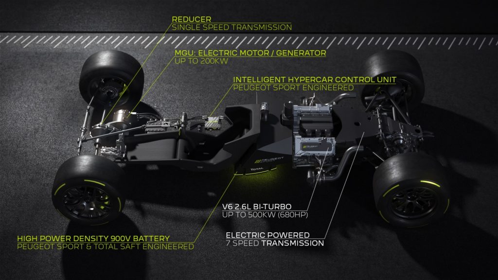 Acum, francezii revin și dezvăluie o parte din secretele tehnice ale modelului de curse. Viitorul hypercar va folosi un sistem de propulsie hibrid format dintr-un motor termic V6 twin-turbo de 2.8 litri amplasat în partea din spate. Motorul va dezvolta 680 CP. Unitatea termică va fi secondată de un motor electric amplasat pe puntea față ce va oferi 272 CP.