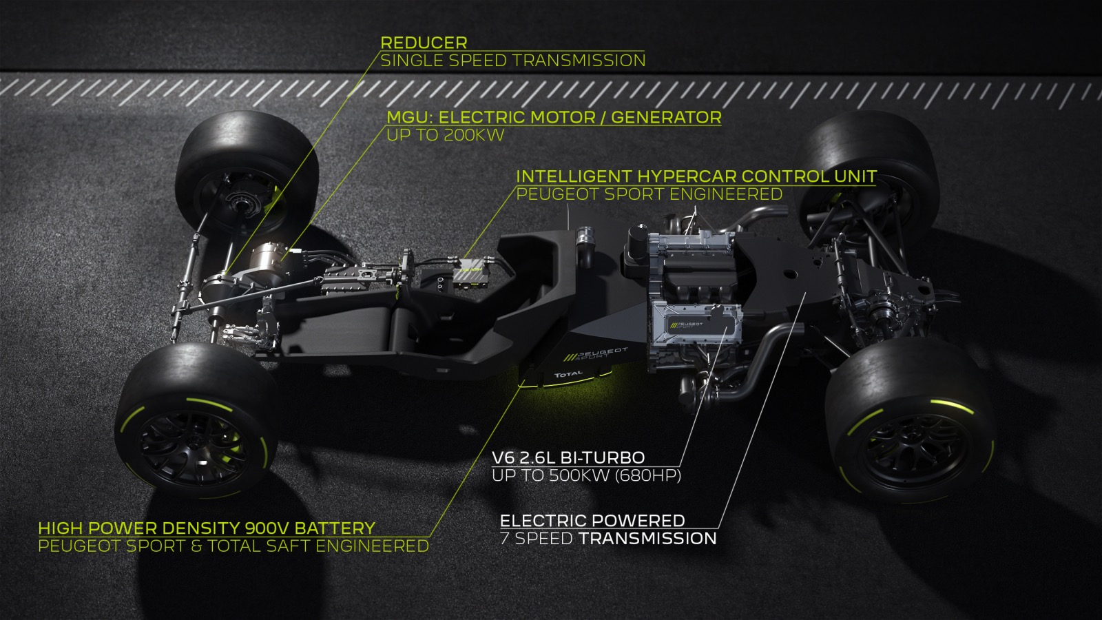 Pentru că regulamentul competiției prevede că puterea maximă este de 680 CP, sistemul hybrid Peugeot va funcționa în limitele acestei puteri. Până la 120 km/oră va fi utilizat doar motorul pe benzină, iar după această viteză, puterea acestuia este limitată la 408 CP și motorul electric intră în ecuație.