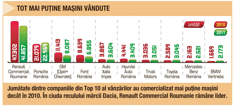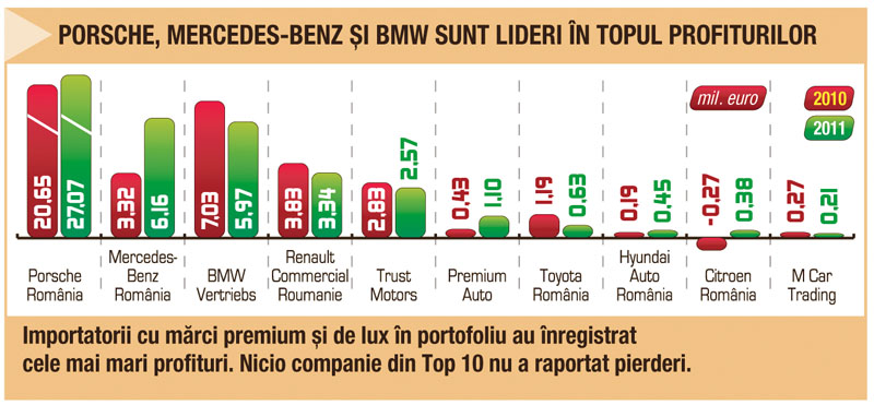 Liderul absolut al pieței românești, Porsche România, importator al mărcilor Audi, Bentley, Porsche, SEAT, Skoda și Volkswagen, a raportat pentru anul trecut o cifră de afaceri de 1,8 miliarde lei (424,4 mil. euro), în creștere de la 1,6 miliarde (376,9 mil. euro) în 2010. La fel se întâmplă și în cazul Mercedes-Benz România, reprezentanta brandurilor Mercedes-Benz și smart. Dacă în 2010 această companie raporta o cifră de afaceri de 531,7 milioane lei (126,2 mil. euro), anul trecut a înregistrat o majorare până la 764,7 milioane lei (180,4 mil. euro).