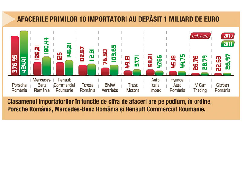 Liderul absolut al pieței românești, Porsche România, importator al mărcilor Audi, Bentley, Porsche, SEAT, Skoda și Volkswagen, a raportat pentru anul trecut o cifră de afaceri de 1,8 miliarde lei (424,4 mil. euro), în creștere de la 1,6 miliarde (376,9 mil. euro) în 2010. La fel se întâmplă și în cazul Mercedes-Benz România, reprezentanta brandurilor Mercedes-Benz și smart. Dacă în 2010 această companie raporta o cifră de afaceri de 531,7 milioane lei (126,2 mil. euro), anul trecut a înregistrat o majorare până la 764,7 milioane lei (180,4 mil. euro).