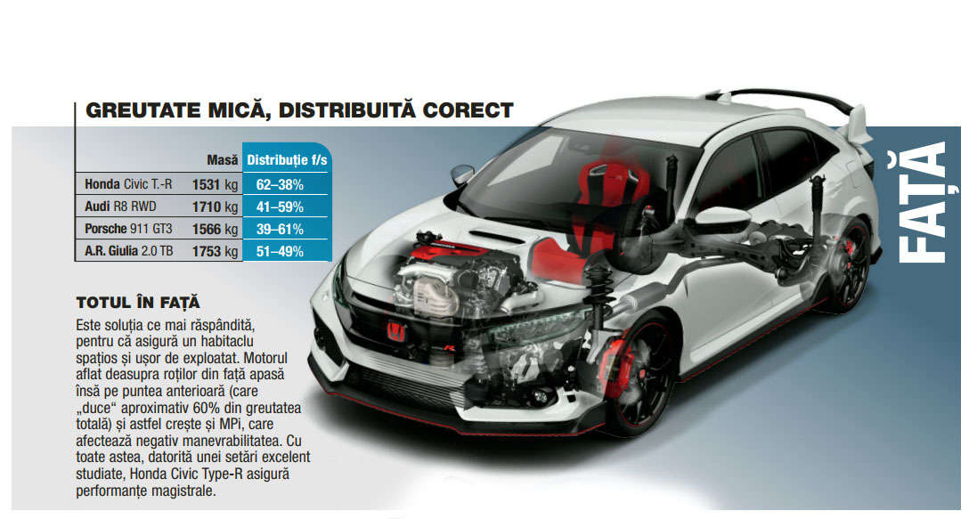 Pentru ca toate astea să se întâmple este esențial ca mașina să fie proiectată într-un anumit mod. Și aici intră în scenă Newton și ale sale „principii ale dinamicii“. Al doilea principiu afirmă că, dacă vrem să imprimăm o accelerație „a“ unui automobil cu masa „m“, trebuie să îi aplicăm o forță „F“. Așadar, pentru a asigura o accelerație rapidă, și forța motorului, și masa mașinii sunt cruciale. Prima trebuie să fie cât mai mare, a doua, cât mai mică. Iar legea asta se aplică pe toate axele. Deci, și la accelerațiile longitudinale (unde motorul sau frânele generează forța), și la cele transversale, adică la schimbarea direcției impusă de roțile din față.
