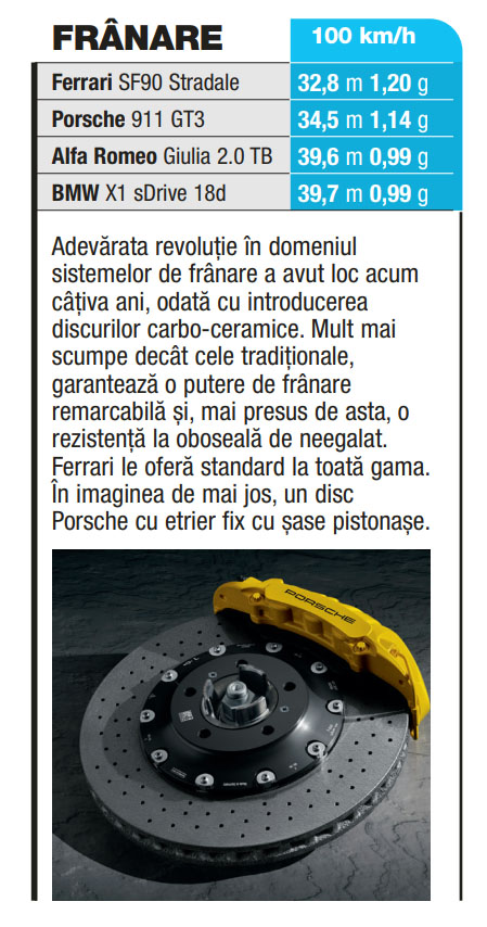 Ce-a mai rămas? Da, sistemul de frânare. Frânarea este, poate, unul dintre cele mai dificile aspecte de rezolvat în cazul mașinilor care să asigure o conducere antrenantă. Pe scurt, mașinile sport au o cursă scurtă a pedalei și necesită un efort suficient de mare pentru a permite modularea forței de frânare cu precizie maximă. Ca o părere personală, cel mai important este punctul de atac, care trebuie să fie apropiat de zona de repaus a pedalei, deci zona „moartă“ a cursei să fie minimă. Un echilibru între cursa scurtă și dozarea fină este greu de găsit.