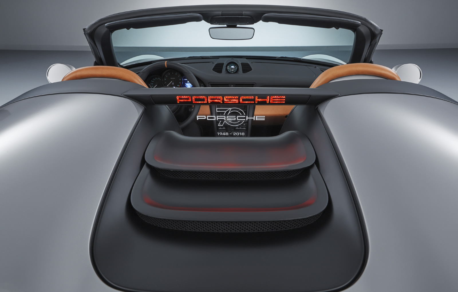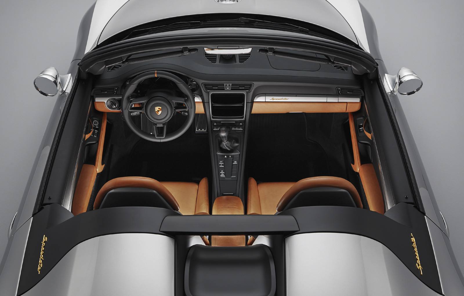 Un parbriz înclinat și un pavilion redus sunt elementele care îi asigură Speedster-ului de la Porsche un profil mai agresiv, asemănător cu cel al predecesorului Porsche 356 1500 Speedster din 1948. Un tonneau protejează interiorul mașinii atunci când aceasta este parcată.