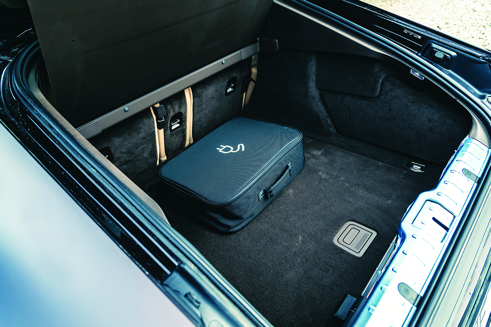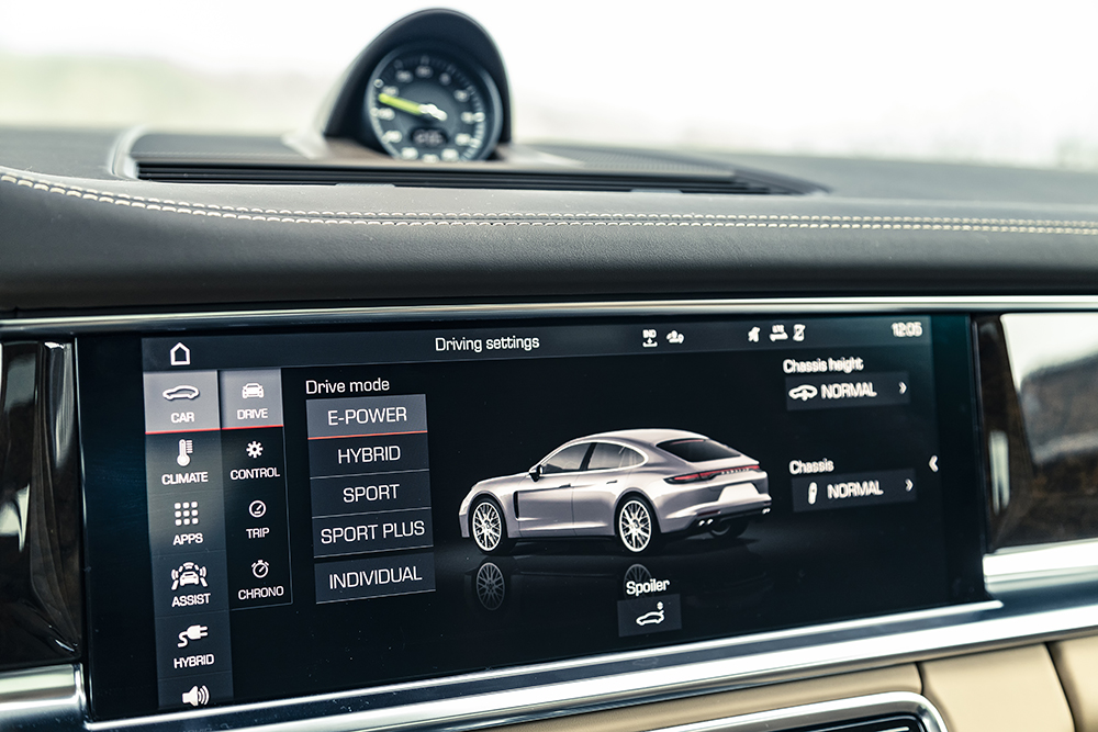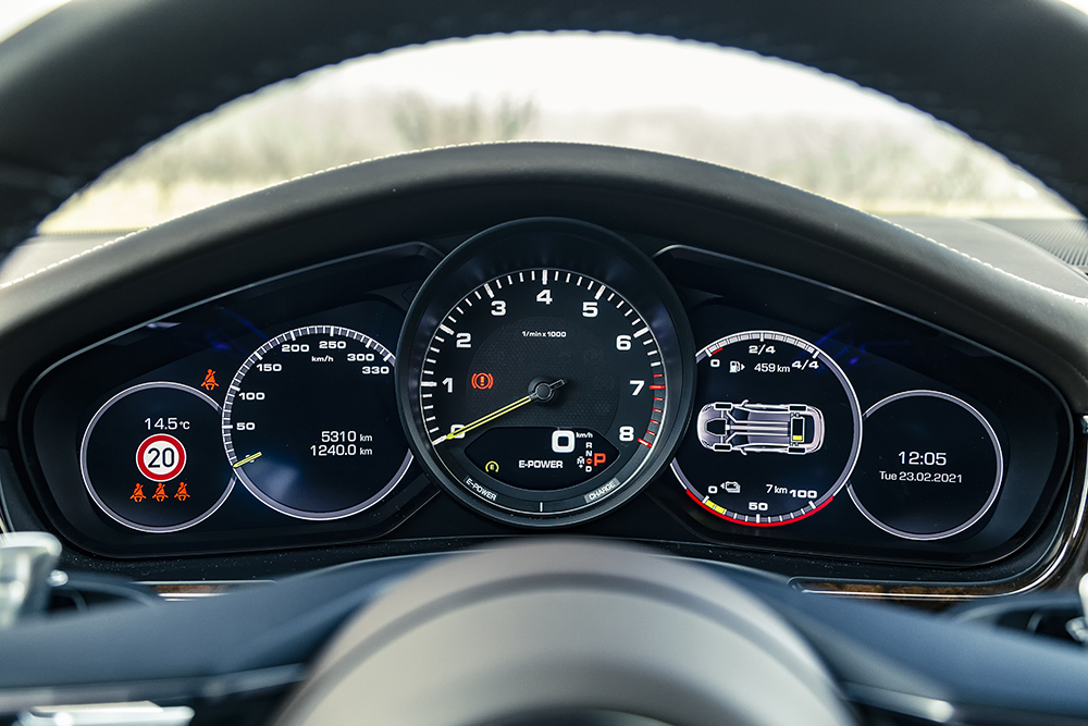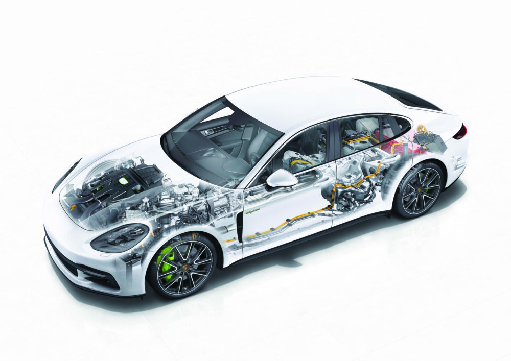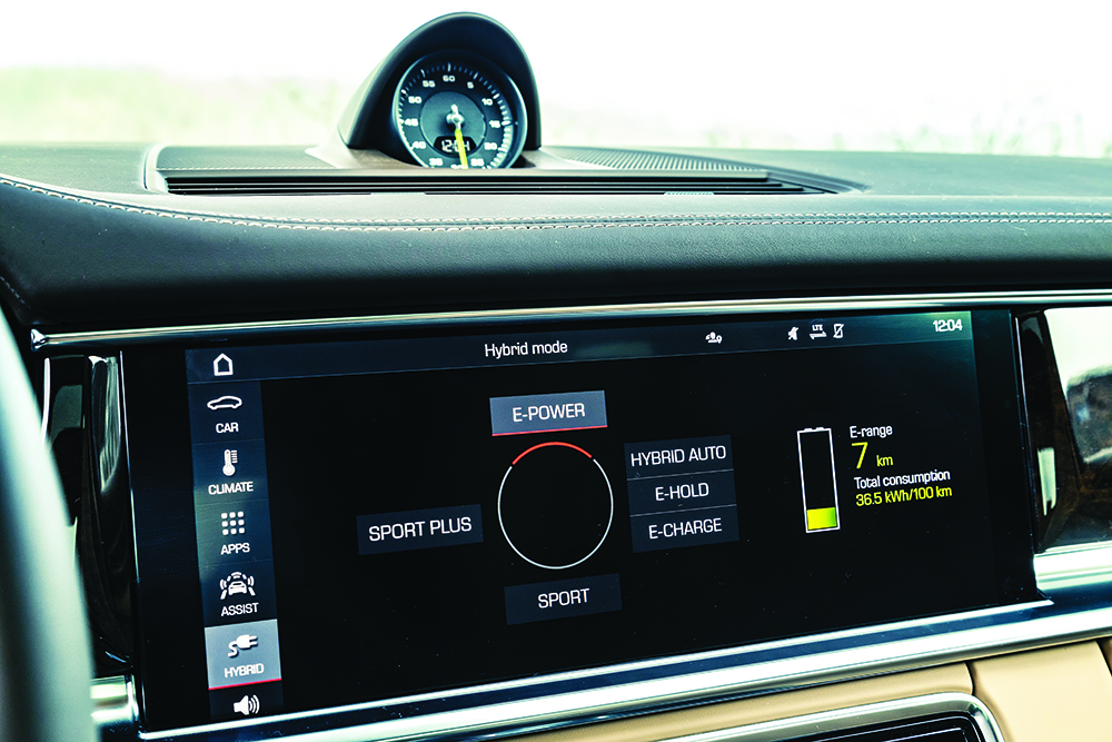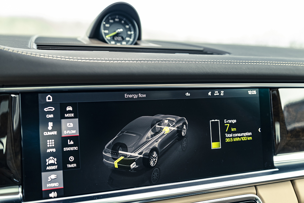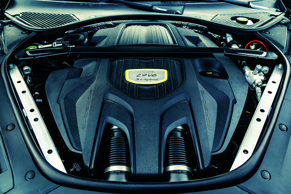 Noi am avut la test versiunea intermediară, 4S E-Hybrid, cu motor electric de 100 kW integrat în carterul ambreiajului, între motorul V6 și cutia PDK cu opt viteze. Propulsorul pe benzină de 2,9 litri este supraalimentat cu două turbocompresoare și dezvoltă 440 CP. În total, ansamblul produce 560 CP și 750 Nm, iar răspunsul la accelerări este instantaneu, datorită motorului electric. Din 2020, bateria Li-Ion a crescut de la 14,1 la 17,9 kWh. Autonomia pur electrică atinge 54 km în ciclu WLTP, dar așteaptă-te la 45 km în realitate. În modul E-Charge, motorul V6 este folosit ca generator de curent și poate încărca bateria până la 80% în mers. Partea electrică a sistemului hibrid plug-in cântărește aproximativ 300 kg, aceasta fiind și diferența de greutate dintre 4S E-Hybrid și omologul convențional, 4S.