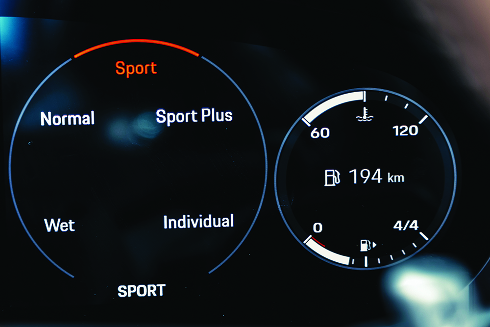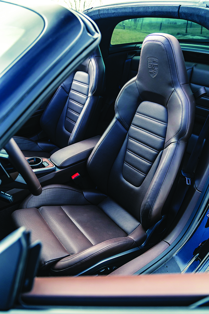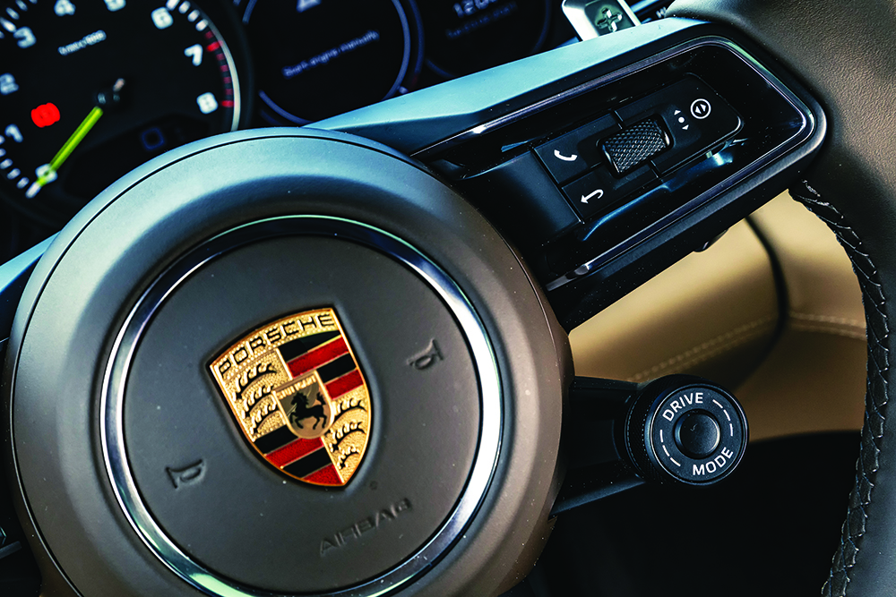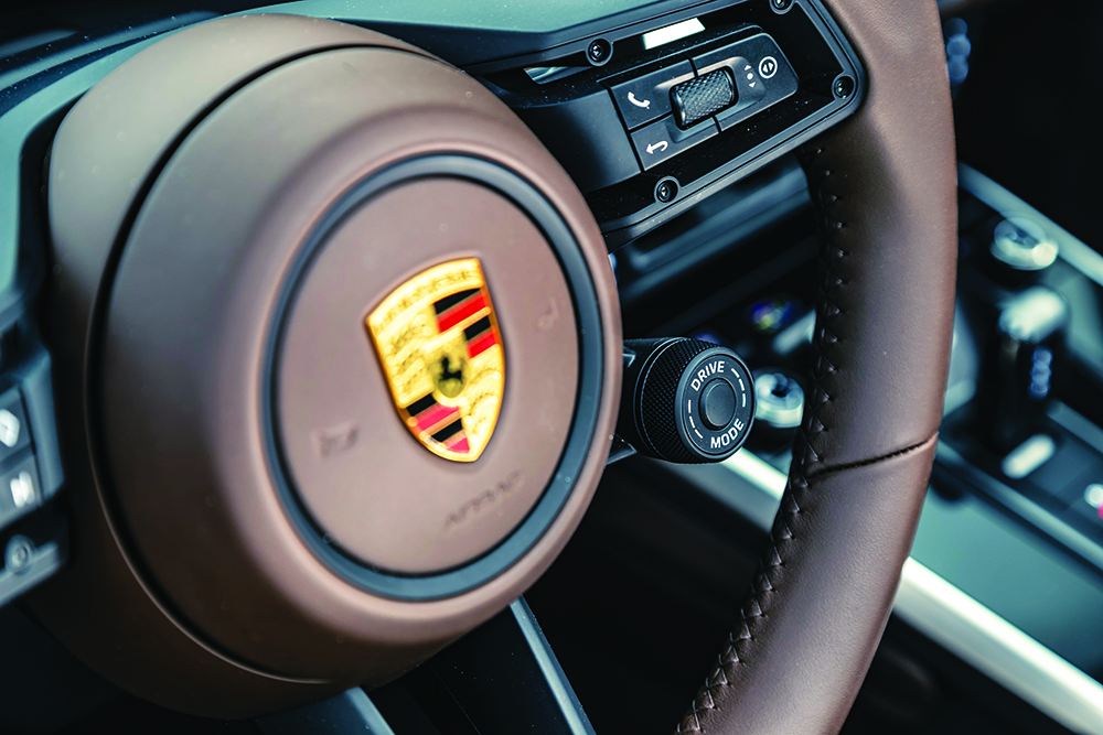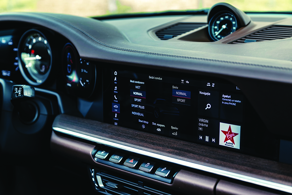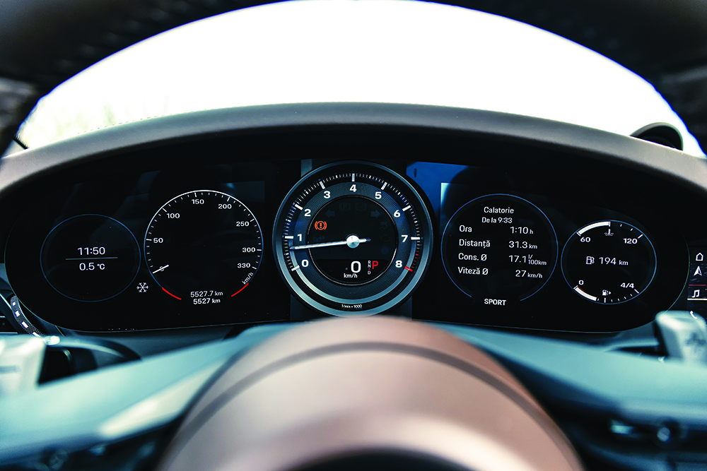 Apoi, e sunetul. Fără să impresioneze în Comfort, capătă o notă gravă când deschizi flapsurile eșapamentului, la apăsarea unui buton. Apoi, odată cu selectarea modului Sport, se transformă într-un triumf al senzațiilor asupra rațiunii, care, cu răcnetul răbufnit din cele 350 de detonații pe secundă, cu pocnetele și bolboroselile eliberate în timpane la frâna de motor, îți umezește ochii de emoție. Îi ștergi și în retrovizoare îți apar șoldurile emblematice pentru toate generațiile 911, care îți obstrucționează vizibilitatea spre spate, dar care, paradoxal, te îmbie să le mângâi cu ocheade nu tocmai decente.