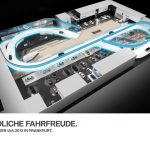 În acest an, punctul de atracţie pentru BMW la IAA vor fi premierele BMW i: modelul electric BMW i3 şi automobilul sport hibrid plug-in BMW i8. Punctul central al standului este circuitul în forma simbolului infinit, pe care BMW i3 şi alte automobile BMW vor fi prezentate în premieră la IAA înainte de lansarea pe piaţă. De-a lungul celor 12 zile ale salonului, aproximativ 9.100 de kilometri – echivalentul distanţei dintre Frankfurt şi San Francisco – vor fi parcurşi cu energie electrică şi, prin urmare, cu emisii zero. Alături de demonstraţiile BMW care vor avea loc din oră în oră pe scena centrală, vizitatorii vor putea lua loc într-un din cele cinci BMW i3 – fiecare cu propria configuraţie – pe “BMW i Walk (Bulevardul BMW i)”.