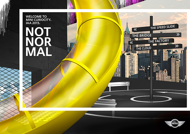 Prezenţa MINI este dominată de actuala campanie de brand “MINI – Not Normal”. Campania globală aduce la viaţă atitudinea personală şi plină de energie a mărcii, pe care vizitatorii IAA o pot experimenta în “MINI Curiocity”. Din perspectiva arhitecturii şi a conţinutului, standul MINI este construit ca un oraş, în care actualele modele MINI pot fi experimentate de aproape într-o manieră unică. În funcţie de teme, modelele sunt organizate în “districte” diferite ale oraşului. Zona expoziţională MINI John Cooper Works rămâne fidelă vitezei: vizitatorii sunt invitaţi să doboare recordul de viteză pe MINI Speed Slide, o pistă înclinată (lungă de 15 metri) destinată adulţilor. La final, fotografii şi timpii de parcurgere sunt afişaţi pe ecrane mari. Modelele de design MINI rulează în cerc, în sensul giratoriu din centrul MINI Curiocity. MINI Roadster şi MINI Cabriolet plutesc în “Cloud” deasupra acoperişurilor oraşului.