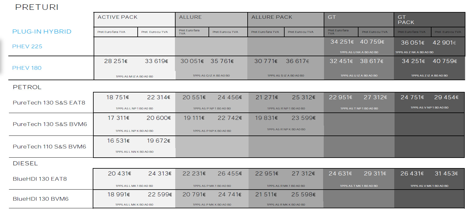 Francezul poate fi comandat cu trei versiuni de motorizare: benzină, diesel și hibrid plug-in. Cea mai ieftină dintre ele este animată de binecunoscutul motor pe benzină, de 1,2 litri, cu 3 cilindri și 110 CP, și pleacă de la 19.672 euro.