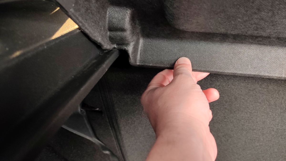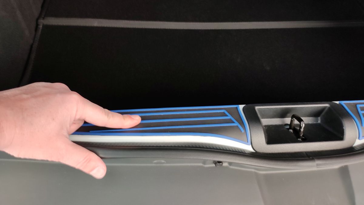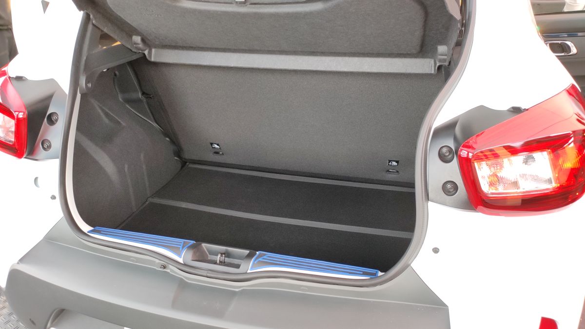 Portbagajul lui Dacia Spring este uriaș pentru dimensiunile mașinii. Este foarte adânc și lat, dar nu are o formă regulată. Spătarul banchetei se rabatează într-o singură bucată, trăgând simultan de cele două pârghii poziționate în capetele lui, iar suprafața formată la rabatare lasă un prag. Polița nu pivotează pe un ax când ridici hayonul, ci stă doar sprijinită în capătul dinspre banchetă. Oarecum. Relativ. Dacă ai peste 1,70 m, ai grijă la cap, pentru că poți lovi hayonul deschis.