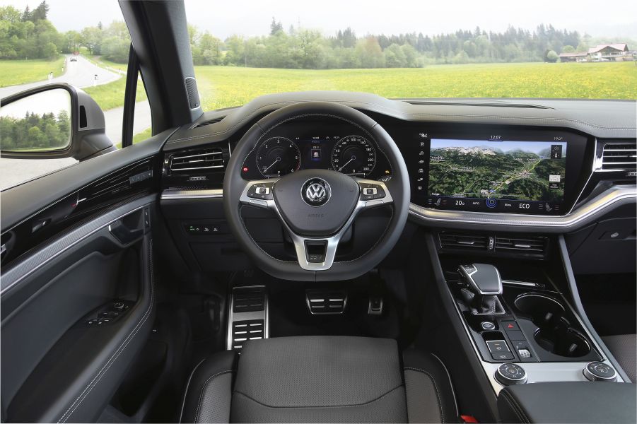 Standard, noul VW Touareg vine cu sistem multimedia Discover Pro cu ecran tactil de 9,2 inci și navigație. Opțional, mașinile de test erau dotate cu noul sistem Innovision Cockpit (2.901,22 euro) care include indicatoare de bord virtuale (Active Info Display) pe ecran de 12 inci, sistem multimedia cu ecran tactil de 15 inci, încărcător wireless, interfață telefonie mobilă și consolă centrală negru lucioasă. Ecranul de 15 inci este cel mai mare montat pe o mașină în Europa și al doilea ca mărime după cel de la Tesla Model S/X. Cele două ecrane sunt practic întrepătrunse, neexistând nicio ramă între ele, iar ecranul de 15 inci al sistemului multimedia este ușor îndreptat spre șofer.