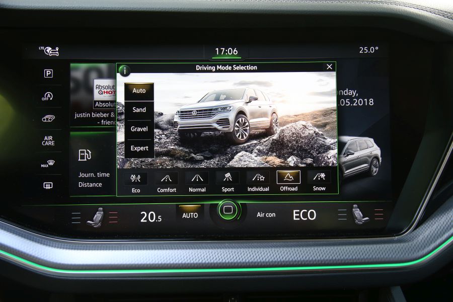 Navigația utilizează hărțile de la Google Maps, mașina fiind dotată cu un SIM separat, Nu există comenzi separate pentru climatizare, acestea fiind tactile și incluse în ecranul sistemului multimedia. Însă spre deosebire de alte modele care utilizează aceeași soluție, la Touareg sunt ușor de accesat, la baza ecranului fiind afișate tot timpul indicațiile de temperatură iar un alt buton oferă acces direct la direcțiile și viteze aerului. Tot la baza ecranului tactil se regăsesc comenzile pentru încălzirea, ventilarea și reglajul lateralelor spătarului și lungimii șezutului ca și pentru programele de masaj.
