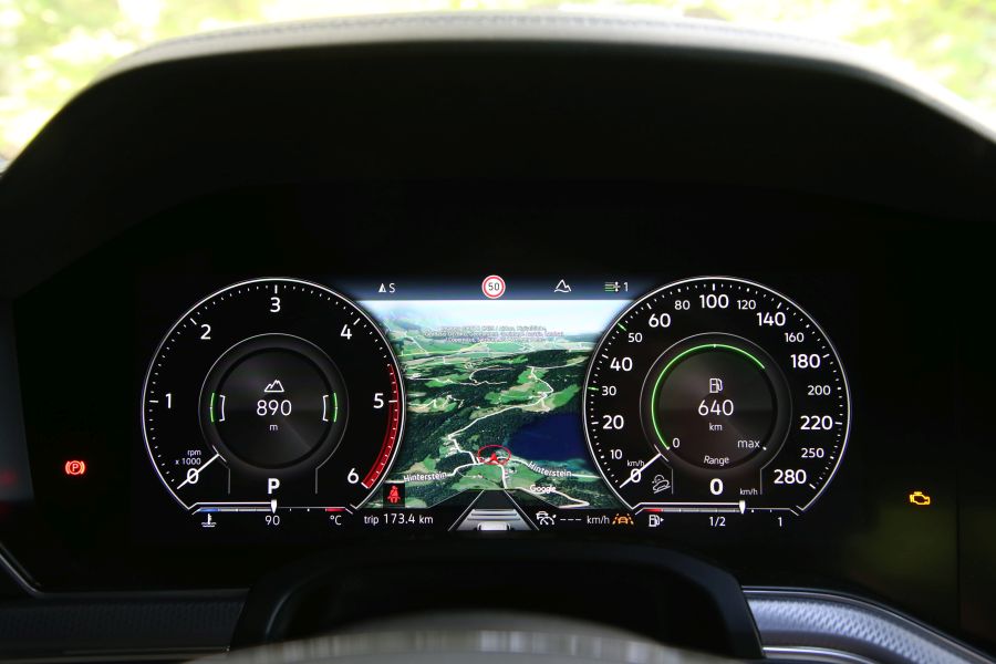 S-a simplificat și modul de afișare de la Active Info Display. Avem de ales între două moduri: cu harta de la navigație în centru și indicatoarele clasice mari în lateral (turometru și vitezometru) sau cu harta de la navigație pe tot ecranul de 12 inci și două informații la alegere. În ceea ce privește informațiile afișate în al doilea mod, din meniul sistemului multimedia se poate configura ce să apară dintre autonomie, busolă, altitudine și informații despre destinația de la navigație. Când se alege afișarea busolei, la apropierea de intersecții, se afișează în detaliu harta intersecției și calea de urmat.