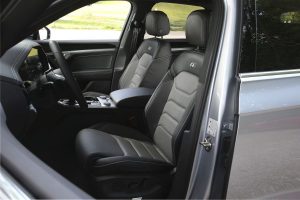 Apoi, dacă comutăm pe modul Comfort al suspensiei pneumatice, VW Touareg oferă un confort la rulare de înaltă clasă deși mașina noastră de test, un R-Line, avea jante de 20 de inci. Mașina plutește efectiv peste drum, Touareg oferind un confort la rulare superior de exemplu lui Mercedes GLE dotat de asemenea cu suspensie pneumatică. La viteze de peste 130 km/h, trenul de rulare este foarte silențios și zgomotul la vânt este redus, o contribuție importantă având și geamurile duble laminate. Doar la accelerări de la viteze mici se aude un ușor zumzăit de diesel.