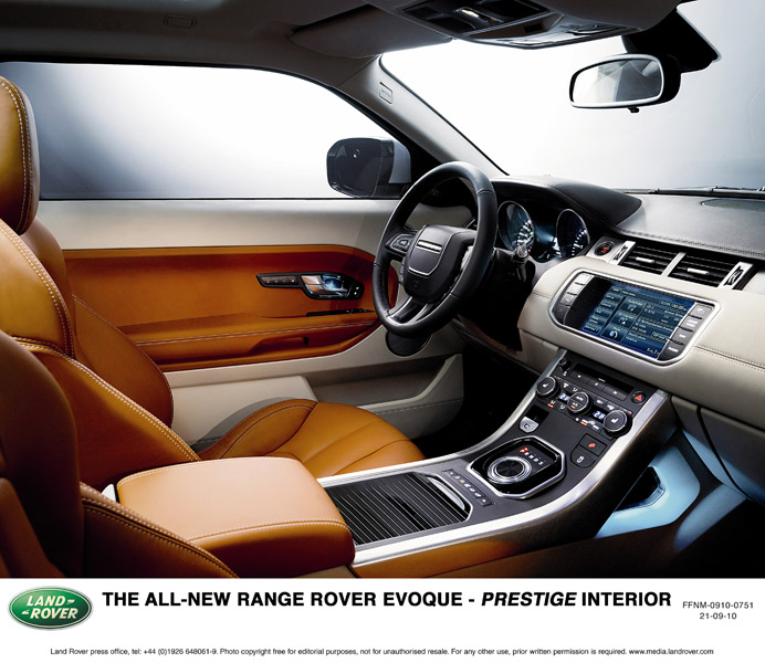 Unic in segmental SUV compact, Range Rover Evouqe permite clientilor sa-si aleaga un interior generos, tapitat cu cea mai fina piele, cusuta cu fir dublu, oferind o finisare de lux pe aproape toata suprafata bordului, scaune si usi. Pentru a evita o abordare traditionala, Range Rover Evoque ofera clientilor spre alegere trei teme de design: contemporanul “Pure”, elegantul “Prestige” si sportivul “Dynamic”.