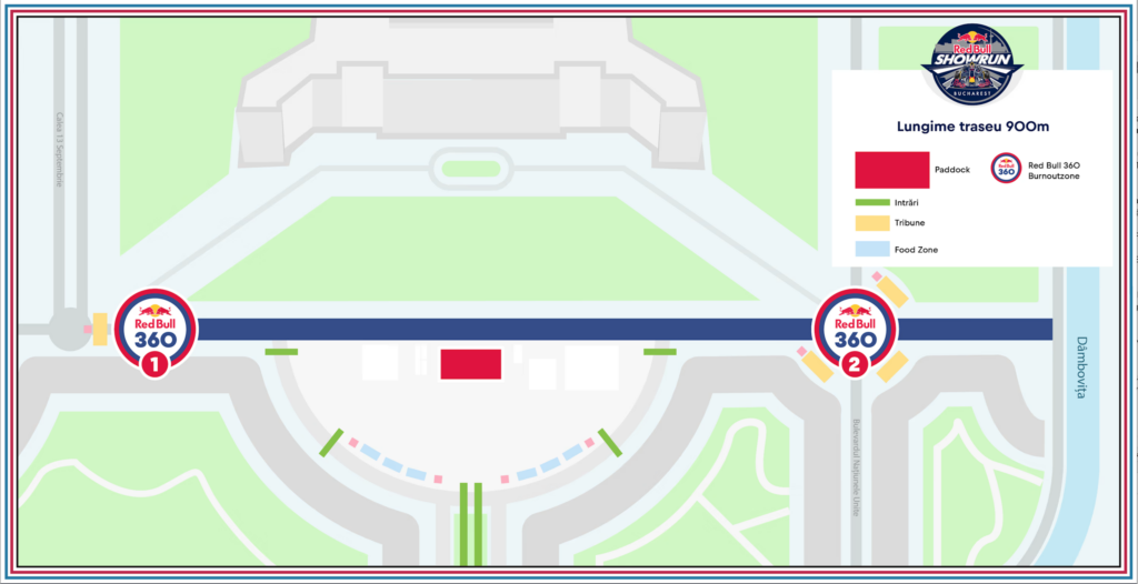 Traseul pregătit va avea o lungime de 900 de metri și include și două secțiuni denumite Burnoutzone. Spectacolul va dura aproximativ trei ore, iar intrarea la evenimentul Red Bull Racing Show este gratuită.