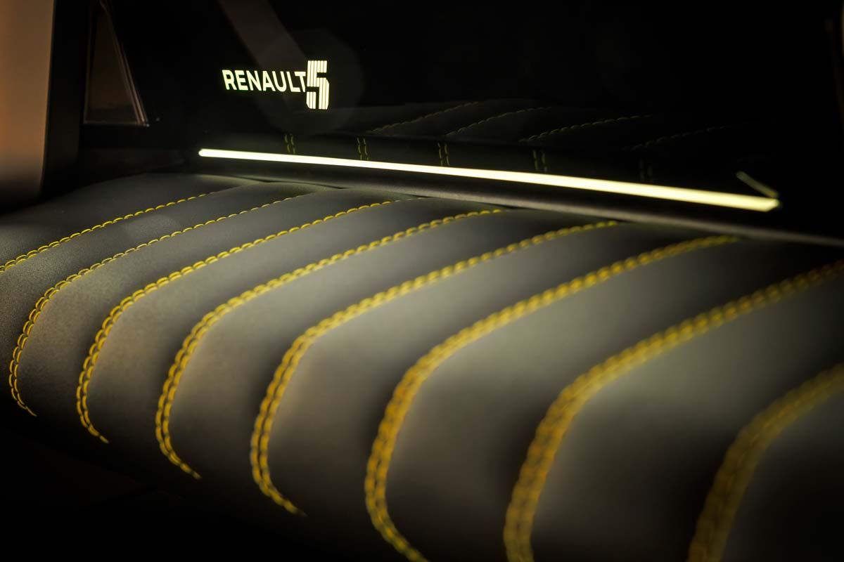 Forma scaunelor este inspirată de a celor de la R5 Turbo, dar tapițeria care le îmbracă, cea de pe bord și de pe fețele de uși este realizată din PET-uri reciclate în echiparea Techno. La cea de top, Iconic Cinq, e din stofă reciclată și include cifra 5.