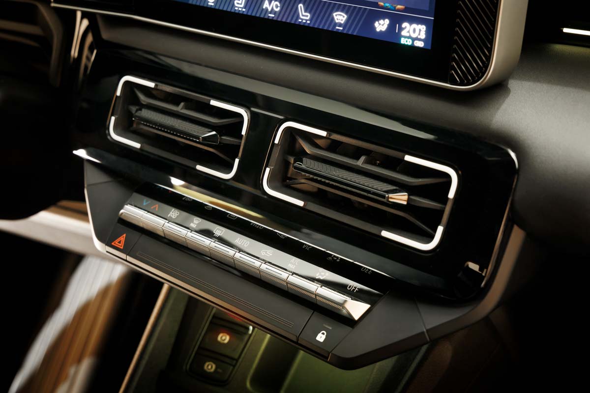 Când deschizi ușa, remarci că principalele caracteristici apărute de-a lungul vieții R5-ului termic s-au păstrat. De exemplu, structura planșei de bord, care are toate comenzile integrate în blocul „aplicat pe bord“ din zona șoferului, lăsând zona pasagerului liberă și structurată pe două etaje. La versiunea de top, Iconic Cinq, sigla Renault 5 este integrată în bord, în zona pasagerului, și iluminată din spate. Volanul este asemănător cu cel de la Megane E-Tech, la fel ca și maneta schimbătorului plasată în spatele său. Gurile de ventilație preiau desenul luminilor de zi.