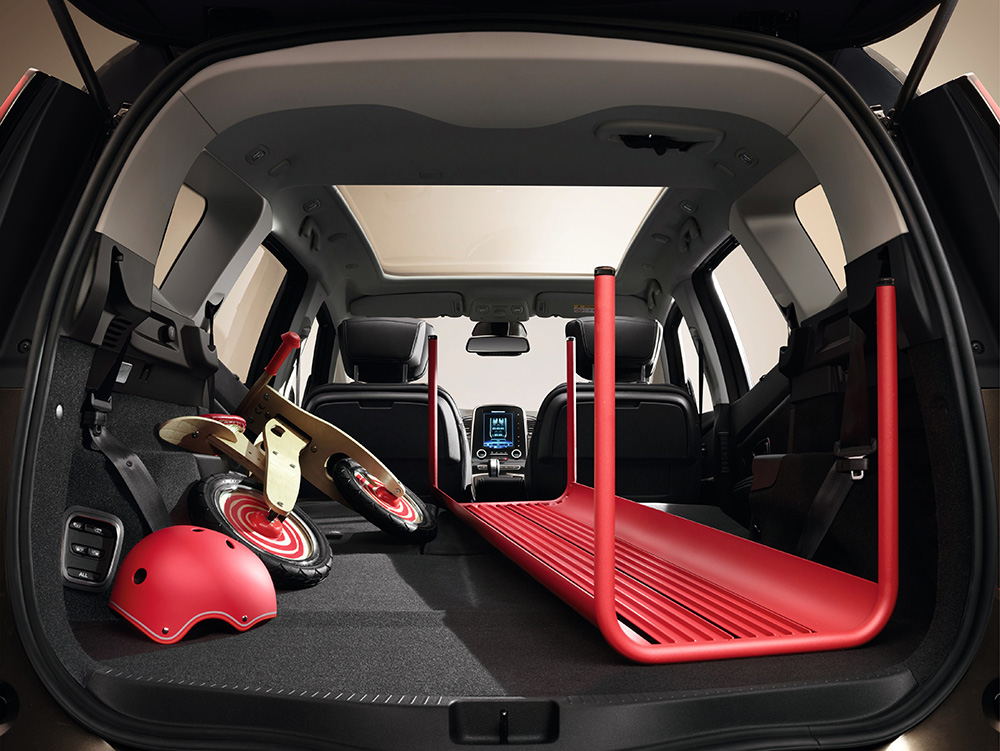 Scaunele din față, împrumutate de la Espace, pot fi reglate electric pe 8 direcții, iar cel al pasagerului – pliat, pentru a obține o lungime de încărcare de 2,85 m. În combinație cu sistemul opțional One Touch Folding Seats, care pliază automat al treilea rând de scaune, se obține o suprafață perfect plană de încărcare. Și asta doar prin atingerea display-ului de pe consila centrală, sau a butonului din portbagaj.