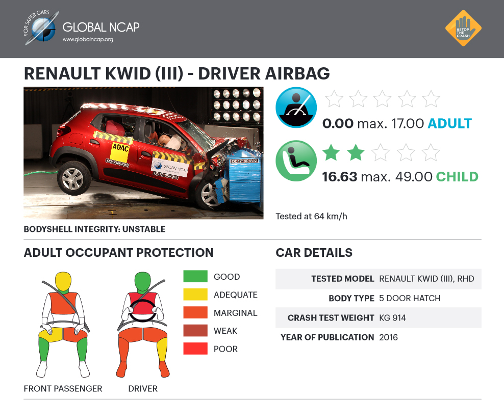 Renault Kwid n-a fost capabil să obțină nici măcat o stea, testat fiind în varianta cu airbag pentru șofer. De ce acest comportament dezamăgitor din partea unui campion al siguranței? Pentru că singurul airbag disponibil pentru piața din India este dotare de top și pentru că ranforsările la nivelul structurii caroseriei din partea pasagerului sunt minime.