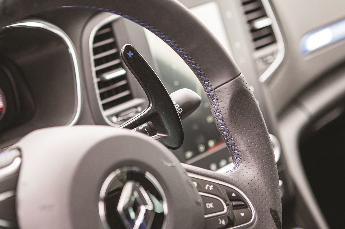 Cum se conduce? În oraș, în sensurile giratorii și la manevrele de parcare este reconfortant să constați că mașina are un diametru de bracaj mai mic decât o mașină cu direcție conevnțională, ceea ce este un aspect practic foarte important. În conducere sportivă, direcția mai scurtă contribuie la o agilitate și incisivitate net superioare, iar la viteze mai mari, roțile spate, care se rotesc cu 1-2 grade în același sens cu cele față, reduc mult subvirarea și îmbunătățesc net aderența. Megane GT nu are acea agresivitate a lui Clio RS dar aduce un feeling de RS fără a sacrifica însă practicalitatea și confortul de zi cu zi. Cutia cu dublu ambreiaj schimbă rapid și prompt la turații mai înalte dar în zona de turații medii este uneori indecisă. La drum întins este însă o alegere foarte bună pentru că permite un condus relaxat. Motorul bi-turbo diesel de 1,6 litri are mult cuplu, marea majoritate a lui fiind disponibilă aproape pe toată plaja de turație, iar prezența celei de-a doua turbine face uitat orice turbo lag.