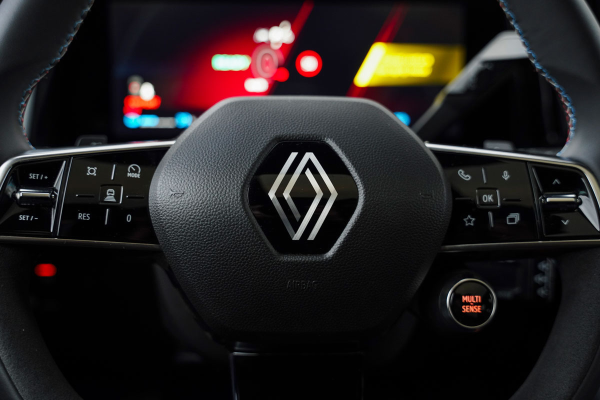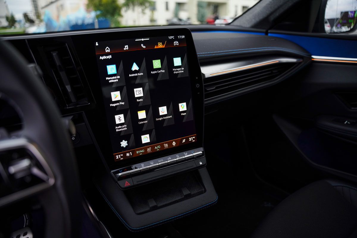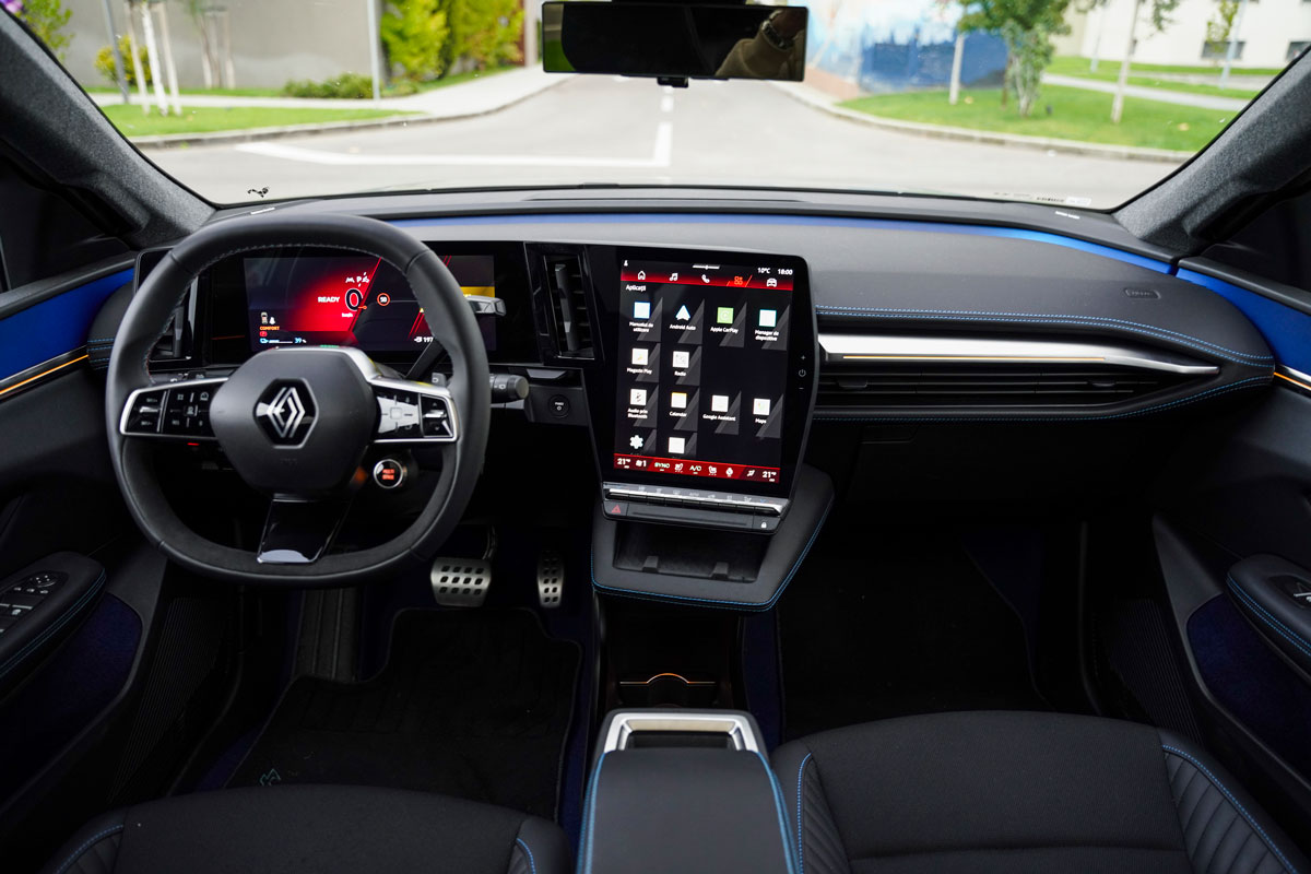 Ambianța este atrăgătoare, pentru că alătură o pereche de ecrane impecabilă ca rezoluție și grafică unor scaune moi, comode, franțuzești. De fapt, o singură plângere am: că nu există o temă cu cadrane rotunde pentru instrumentarul de bord. Materialele sunt moi și plăcute la atingere, iar cei 10 cm în plus față de Megane E-Tech se regăsesc în mare parte în spațiul pentru picioare.