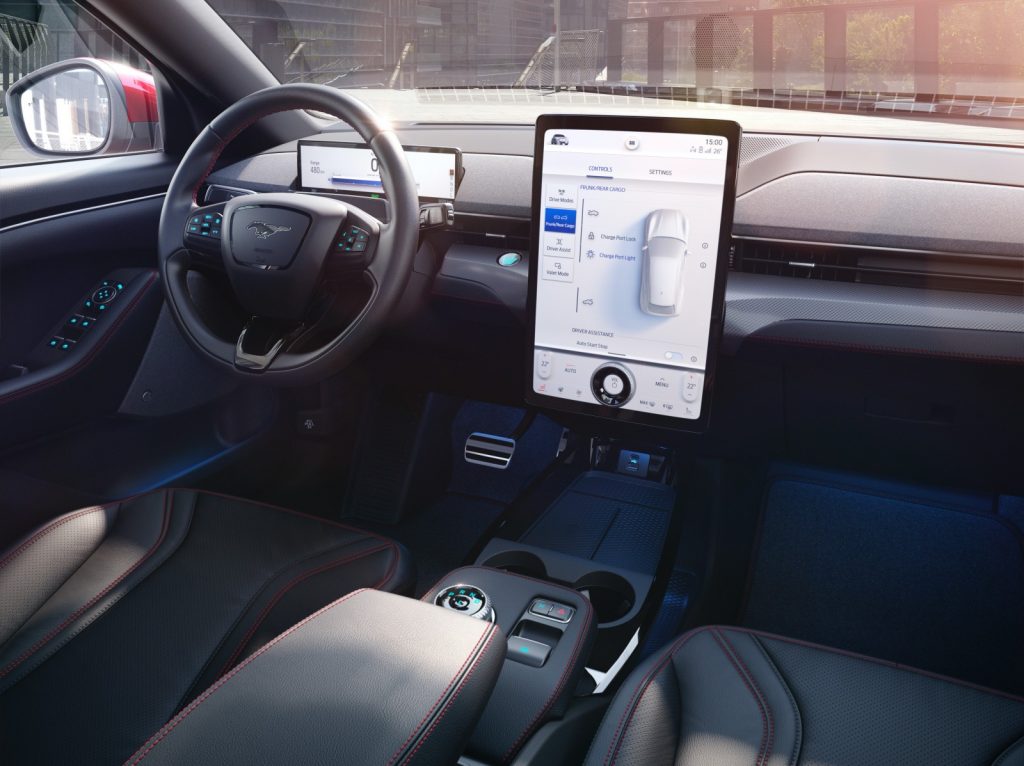 La interior, Ford s-a inspirat de la rivalii americani Tesla, cea mai nouă generație a sistemului infotaniment SYNC adoptând un display vertical de 15.5 inch amplasat central. În fața celui de la volan există un al doilea ecran de 10.2 inch.