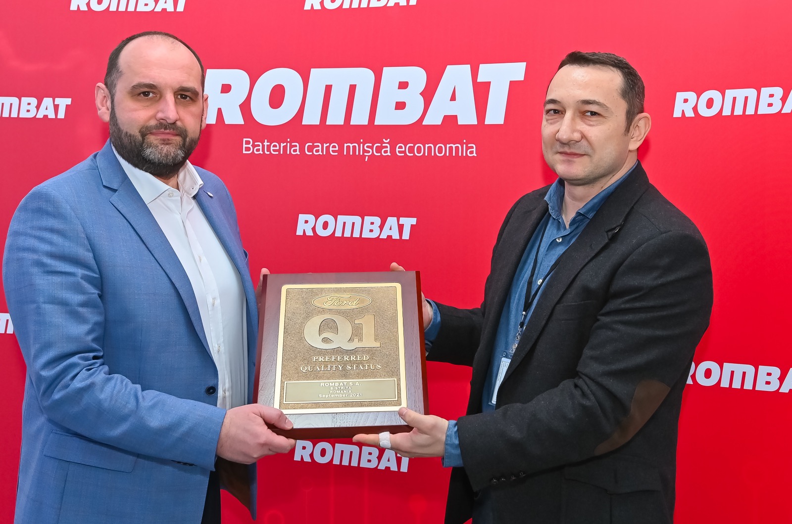Placheta, reprezentând certificarea Q1 Ford, a fost înmânată CEO-lui Rombat, Alin Ioaneș, de către Bereczki Zsolt, Interior/Electrical STA Engineer (STA- Supplier Technical Assistance) Ford, în cadrul unei ceremonii organizate la sediul Rombat Bistrița, în prezența managementului companiei.