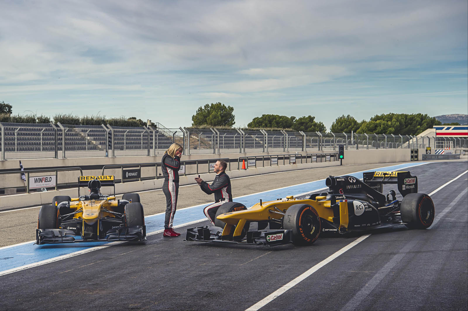 Pentru a face ziua perfectă, cei doi au urcat la volanul unor monoposturi Formula Renault 2.0 cu 800 de cai putere. Sunt monoposturile folosite în ssezonul 2012, vopsite însă, ca monoposturile folosite astăzi în Formula 1.
