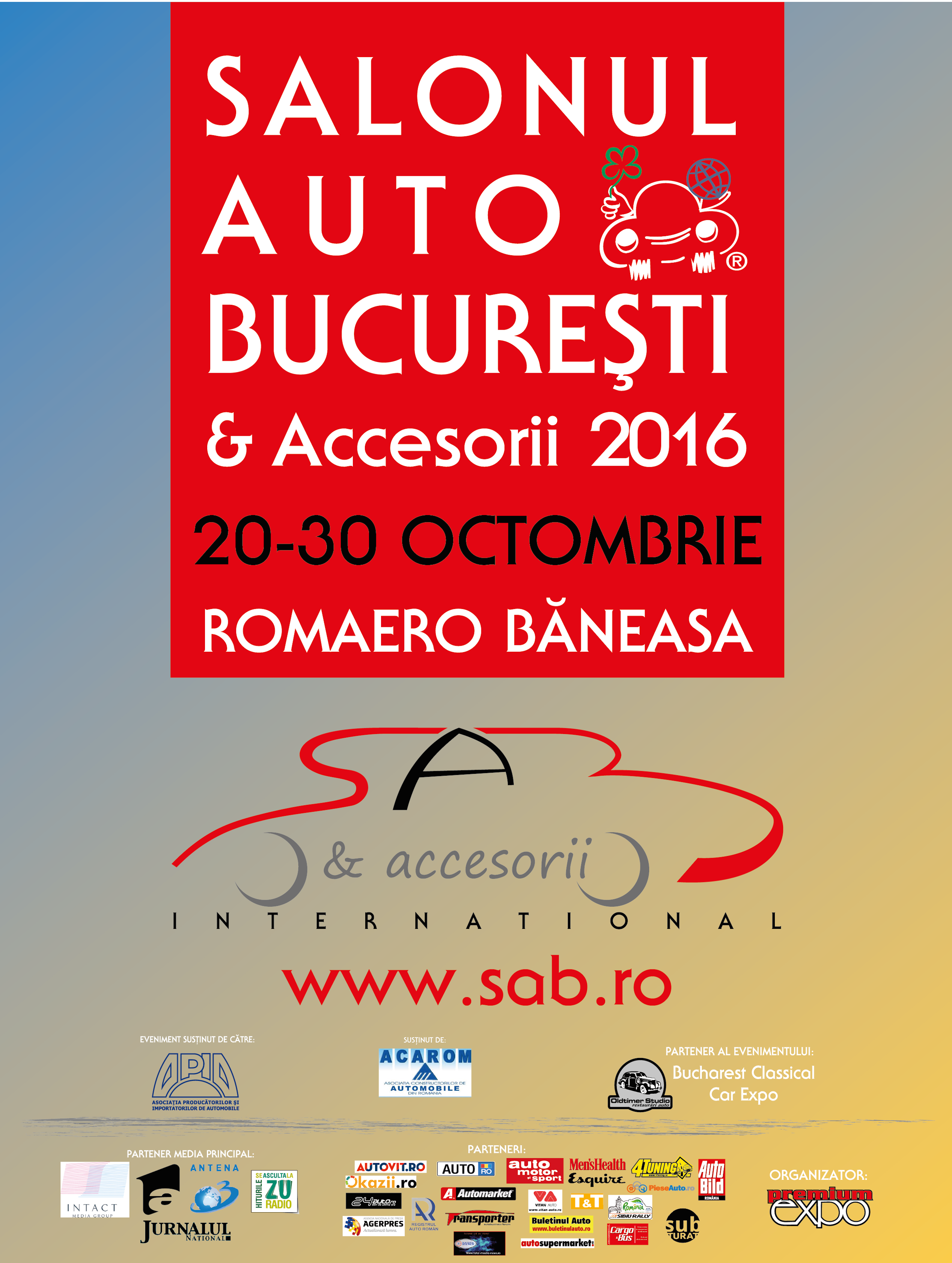 Salonul Auto Bucuresti & Accesorii, editia a XIV-a internationala si platforma de business nr. 1 a domeniului auto din Romania va avea loc in perioada 20 – 30 octombrie 2016 pe o suprafata de peste 25.000 mp in cadrul complexului Romaero Baneasa.