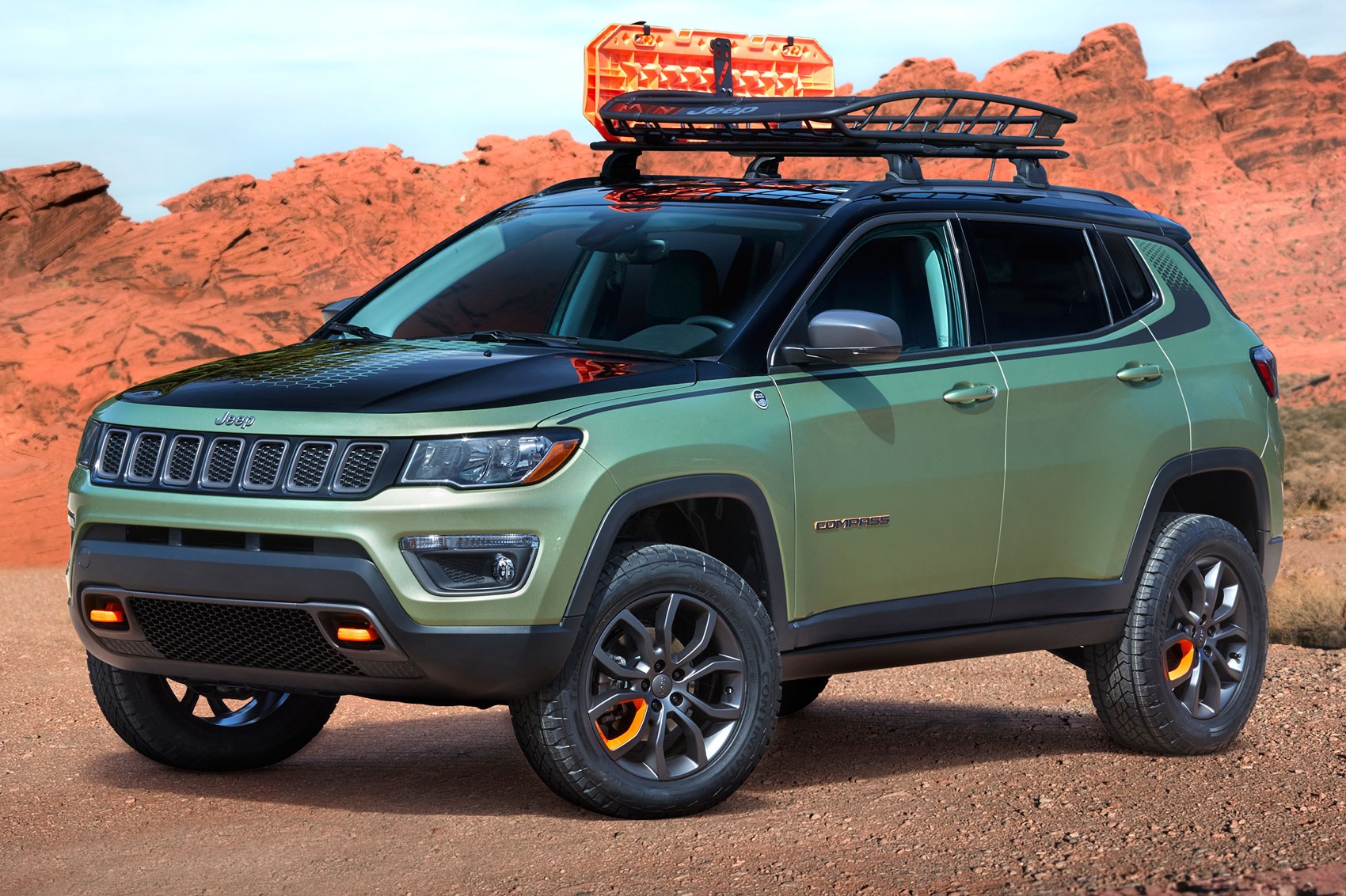 Conceptul Trailpass are un scop precis: perfecționarea abilităților off-road, deja respectabile, ale noii generații Jeep Compass. Finisat într-o nuanță inedită de verde metalizat cu accente portocalii, Trailpass a primit scaune cu design special, tapițerie din piele, anvelope profesionale Continental TerrainContact și un coș cu rol de portbagaj, montat pe acoperiș.