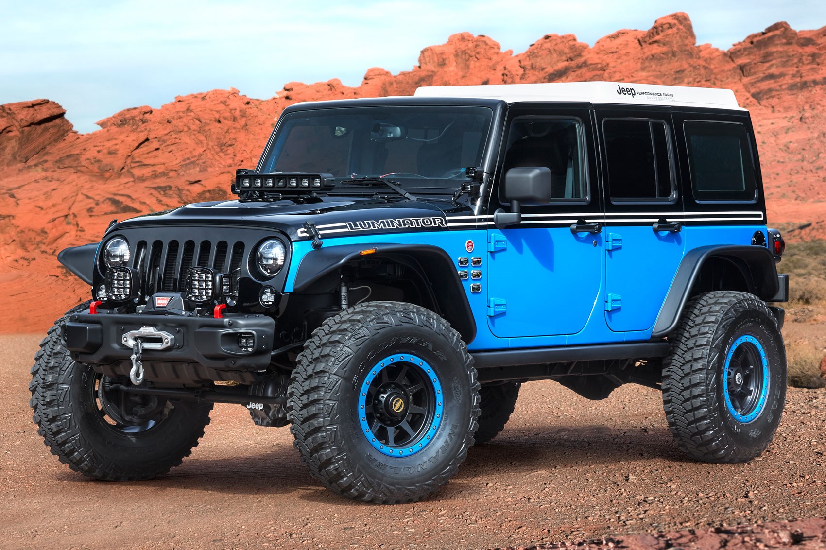 Așa cum sugerează și numele său, Jeep Luminator este înzestrat cu suficiente rampe de lumini LED pentru a transforma chiar și cele mai întunecate nopți petrecute sub cerul liber într-un festin de lumină și culoare. Luminator a fost, bineînțeles, construit pentru a ilustra toate opțiunile oferite de Jeep Mopar în materie de sisteme de iluminare aftermarket.