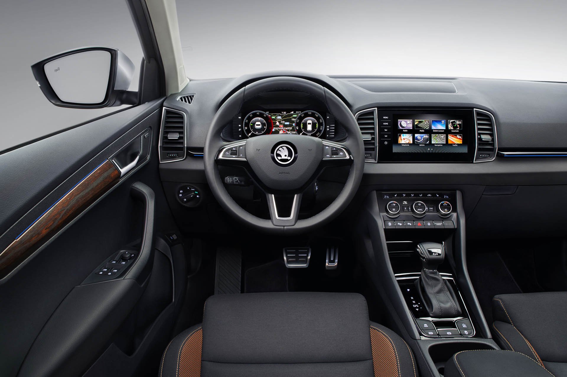 Logo-uri speciale, amplasate pe aripi, menite să îi confirmă natura aventuroasă și un interior restilizat special pentru off-road sunt, de asemenea, noutățile trecute în contul SUV-ului Karoq Scout. Mașina primește tapițerie în combinația negru-maro și cusături contrastante, sistem de iluminare ambientală LED și pedale cu detalii din oțel inoxidabil.
