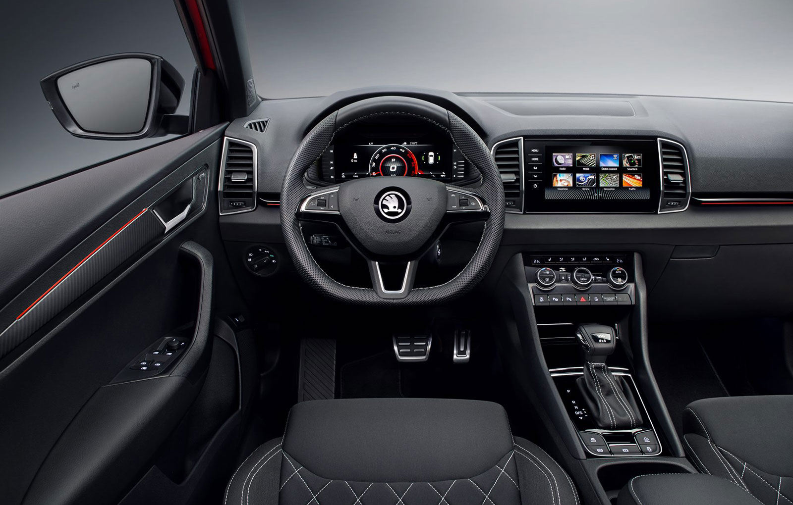 Karoq Sportline primește scaune sport cu reglaj lombar, tapițerie neagră textilă și cusături contrastante,un volan îmbrăcat în piele și pedale cu elemente din oțel inoxidabil. Sistemul de iluminare ambientală LED asigură o atmosferă deosebită la bord. Mașina poate fi comandată și cu instrumentarul de bord digital, cu detalii care îi sporesc natura sportivă.