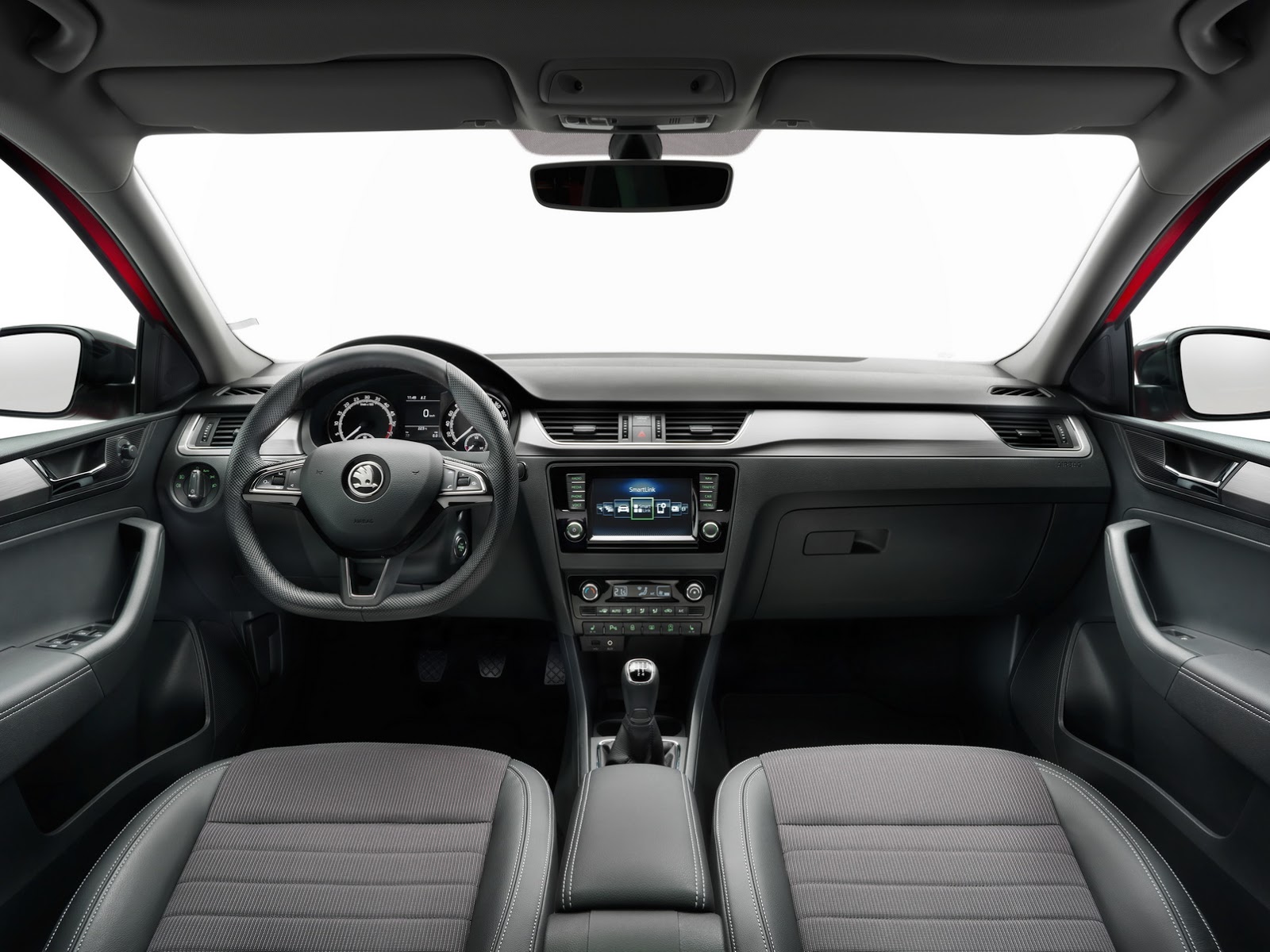 La interior, schimbările sunt chiar mai profunde. Skoda Rapid poate fi echipată cu un sistem multimedia modern, cu touchscreen color de 6,5 inch, navigație 3D și funcții de screen mirroring și hotsport Wi-Fi. Noi guri de ventilație, fețe de uși modificate, un volan nou și inserții mai mari cu aspect metalic sau piano black la nivelul planșei de bord și-au făcut de asemenea apariția. Volumul portbagajului a rămas neschimbat: 550 litri.