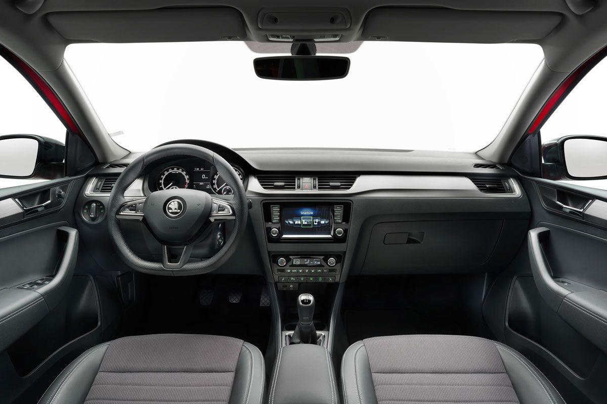 La interior, schimbările sunt chiar mai profunde. Skoda Rapid poate fi echipată cu un sistem multimedia modern, cu touchscreen color de 6,5 inch, navigație 3D și funcții de screen mirroring și hotsport Wi-Fi. Noi guri de ventilație, fețe de uși modificate, un volan nou și inserții mai mari cu aspect metalic sau piano black la nivelul planșei de bord și-au făcut de asemenea apariția. Volumul portbagajului a rămas neschimbat: 550 litri.